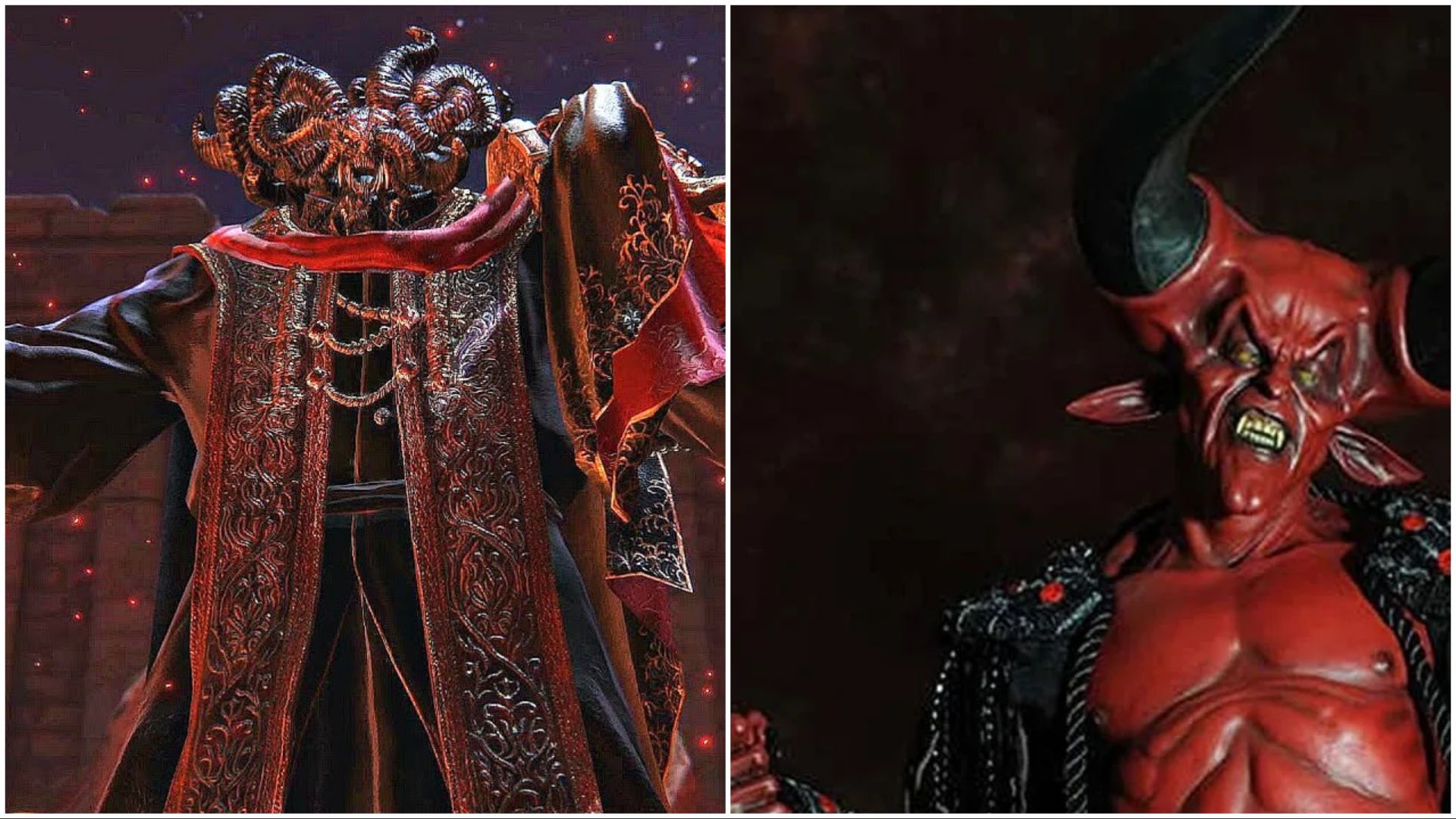 Red, horned figures frequently appear as villains in movies, a tradition rooted in their historical connection to evil—going back to biblical times. However, the resemblance between Mohg, Lord of Blood, and the Lord of Darkness from Legend is striking.