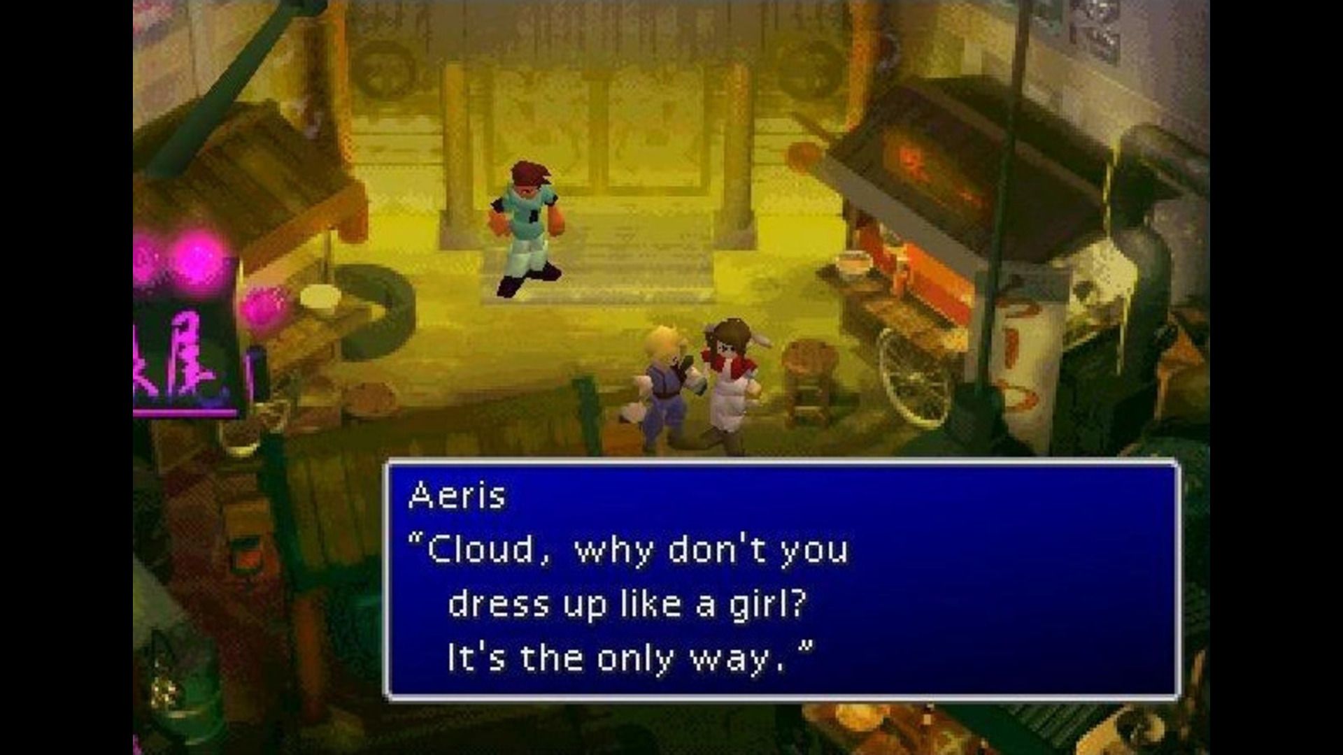 At the beginning of Final Fantasy VII, you’d probably expect a tough mercenary like Cloud to be fighting, not dressing in disguise. But surprisingly, that’s exactly what happens early in the game. To infiltrate Don Corneo’s mansion, Cloud has to dress as a woman, and it’s a memorable and clever moment in a game filled with great storytelling.