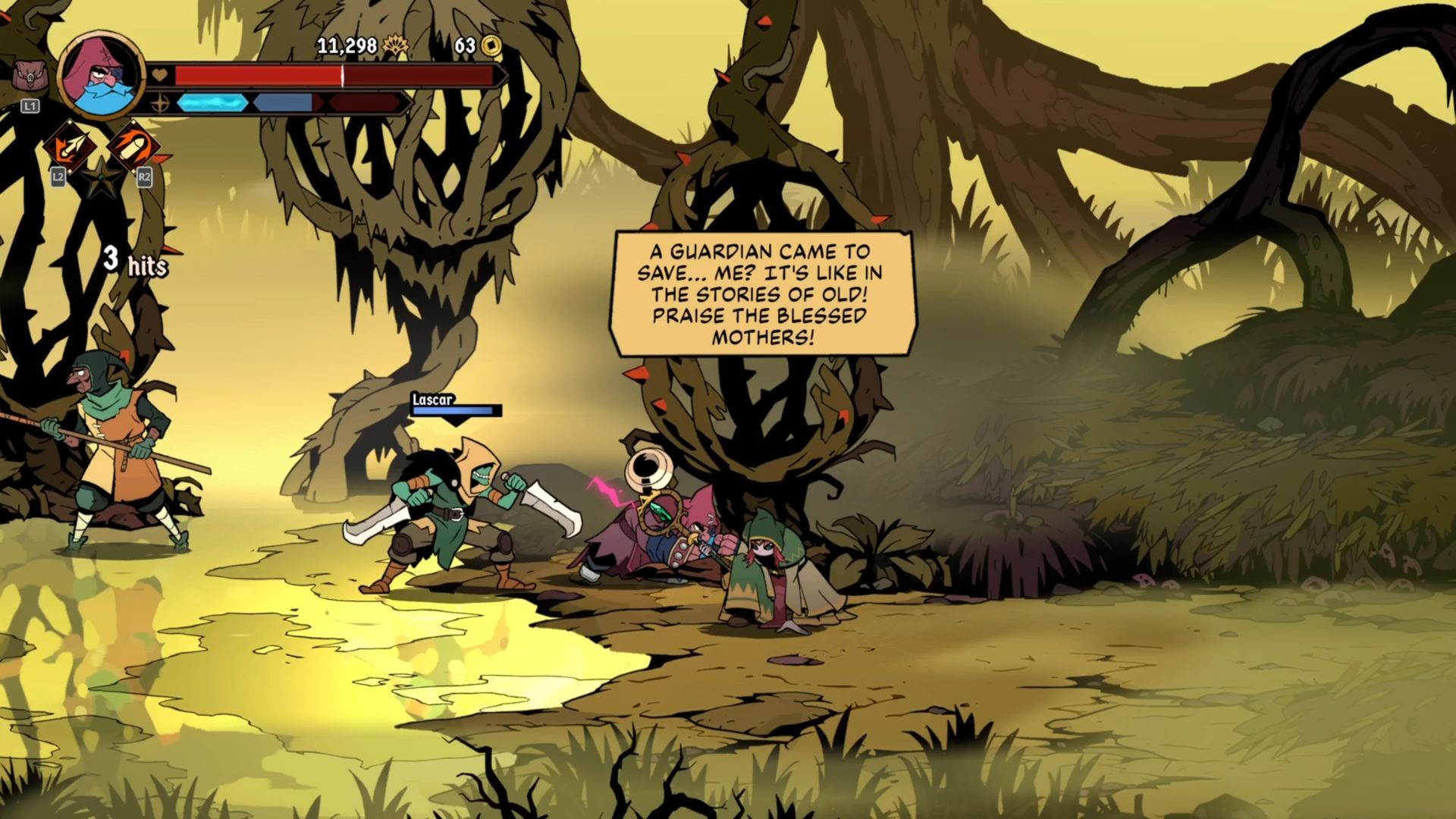 Cider fights much like Galandra, relying on punches and kicks. But Cider has a special heavy attack: she fires a grappling hook to pull herself towards enemies, letting her launch into the air and attack from above.