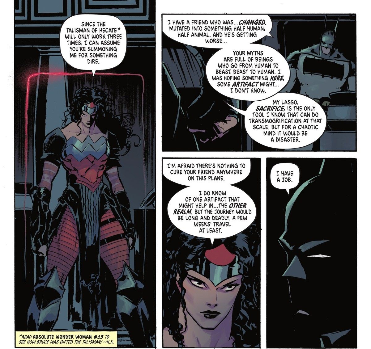 Absolute Batman #16 is a fantastic issue, but you’ll get even more out of it if you’ve already read the Absolute Wonder Woman team-up story. Some of the subtler moments showing the developing connection between Batman and Wonder Woman might be missed otherwise. Still, it’s a top-tier comic and well worth reading.