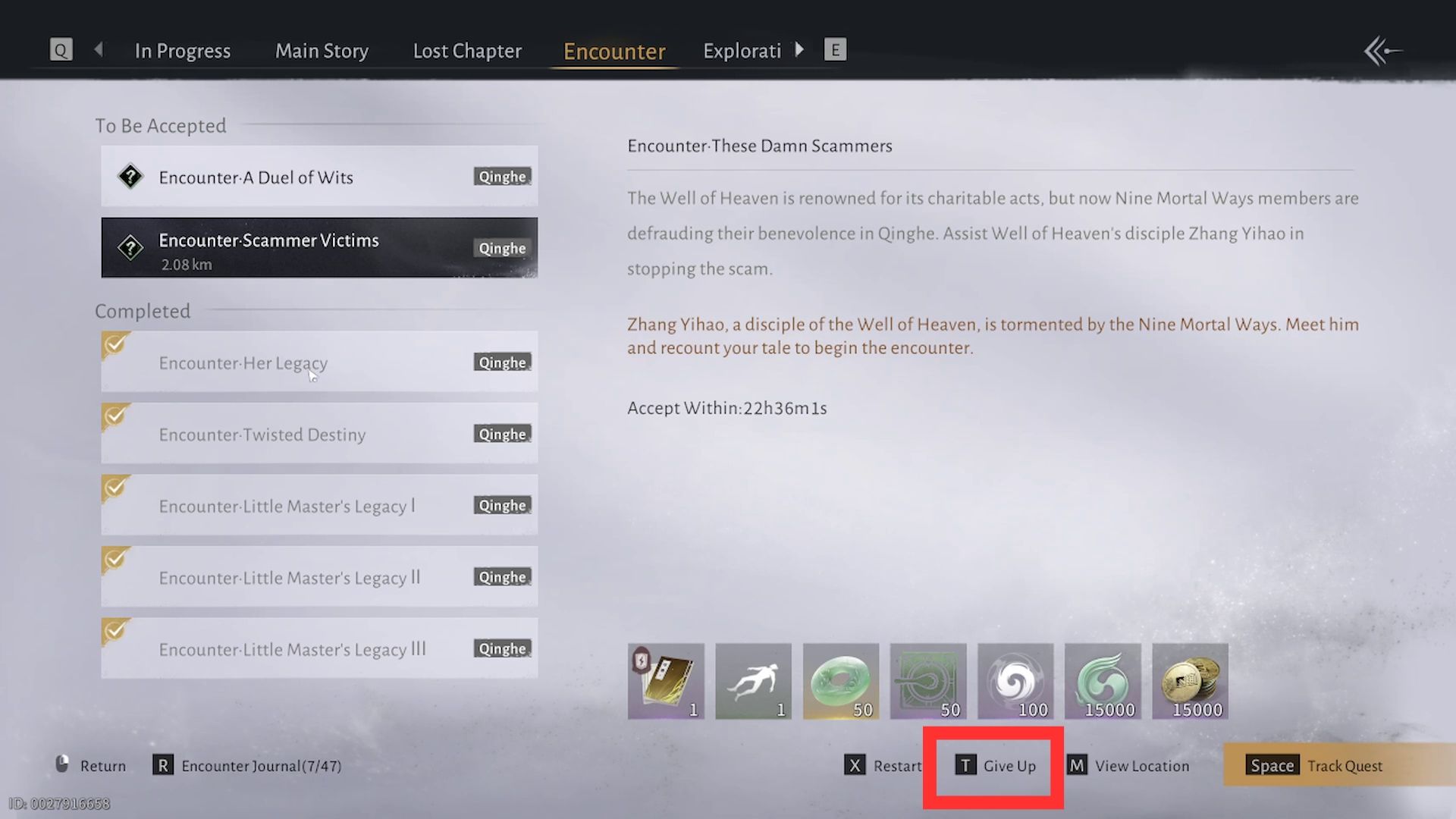 - Open Journal (J), go to the Encounters Tab, and either Give Up (T) all active Encounters or complete them to clear the log.