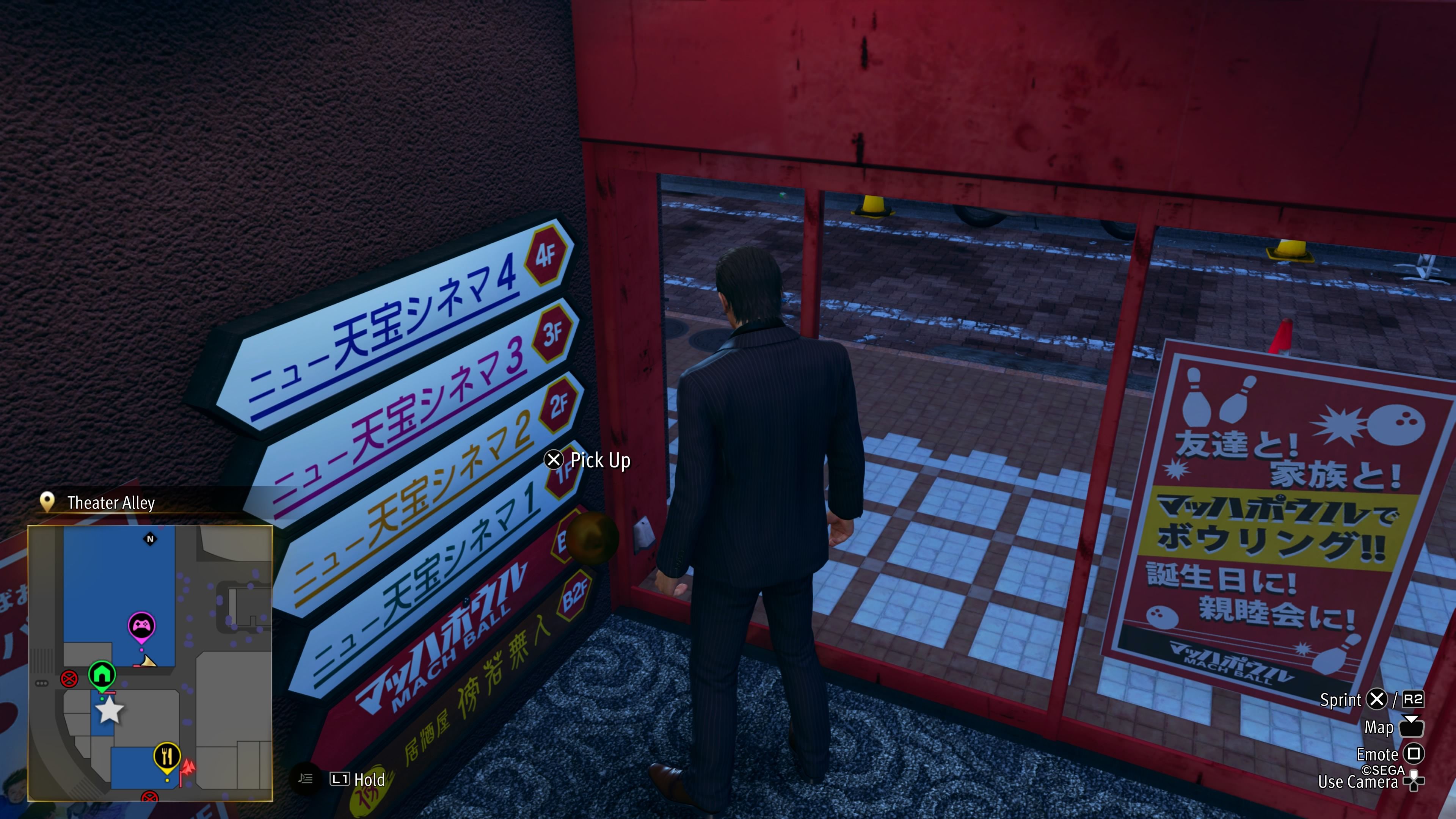 The first one is actually right across from the Nishikiyama Family HQ. This one’s in the Mech Bowl, but contrary to what you think, this isn’t a reward from the bowling mini-game itself. Instead, head inside through the automated doors, but do not enter the building itself. Look to the immediate right of the entrance, and you can spot the golden ball attached to one of the signs here. Ironically, on the small Mech Bowl sign itself. |