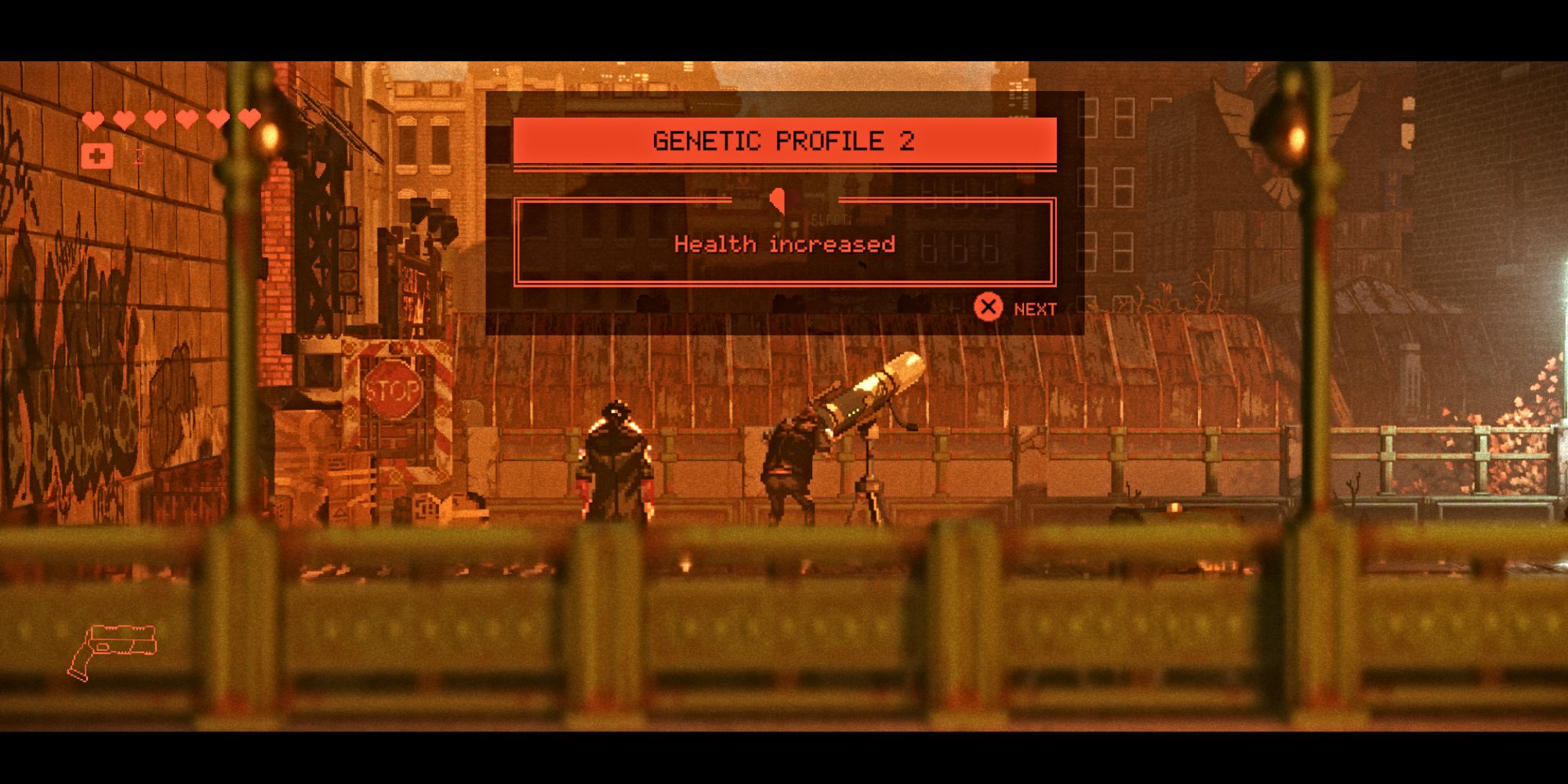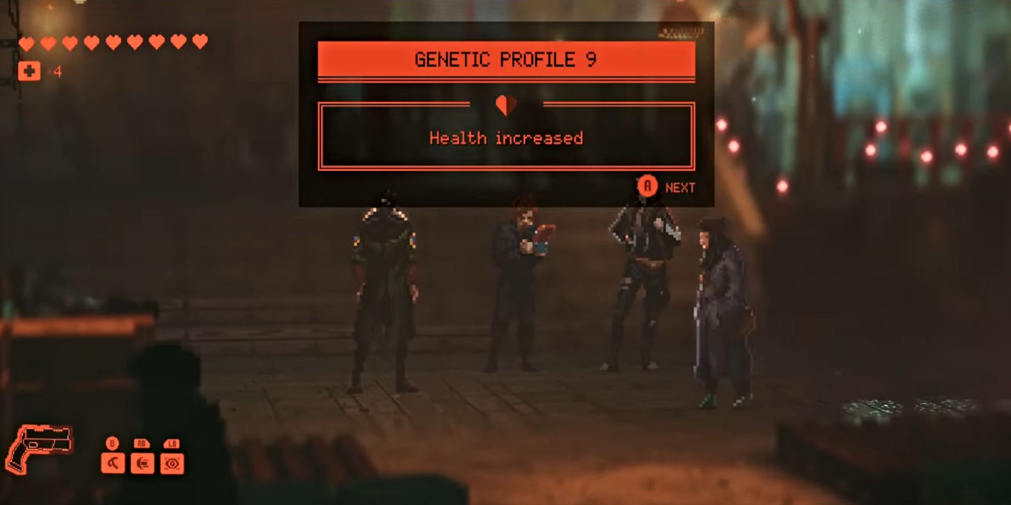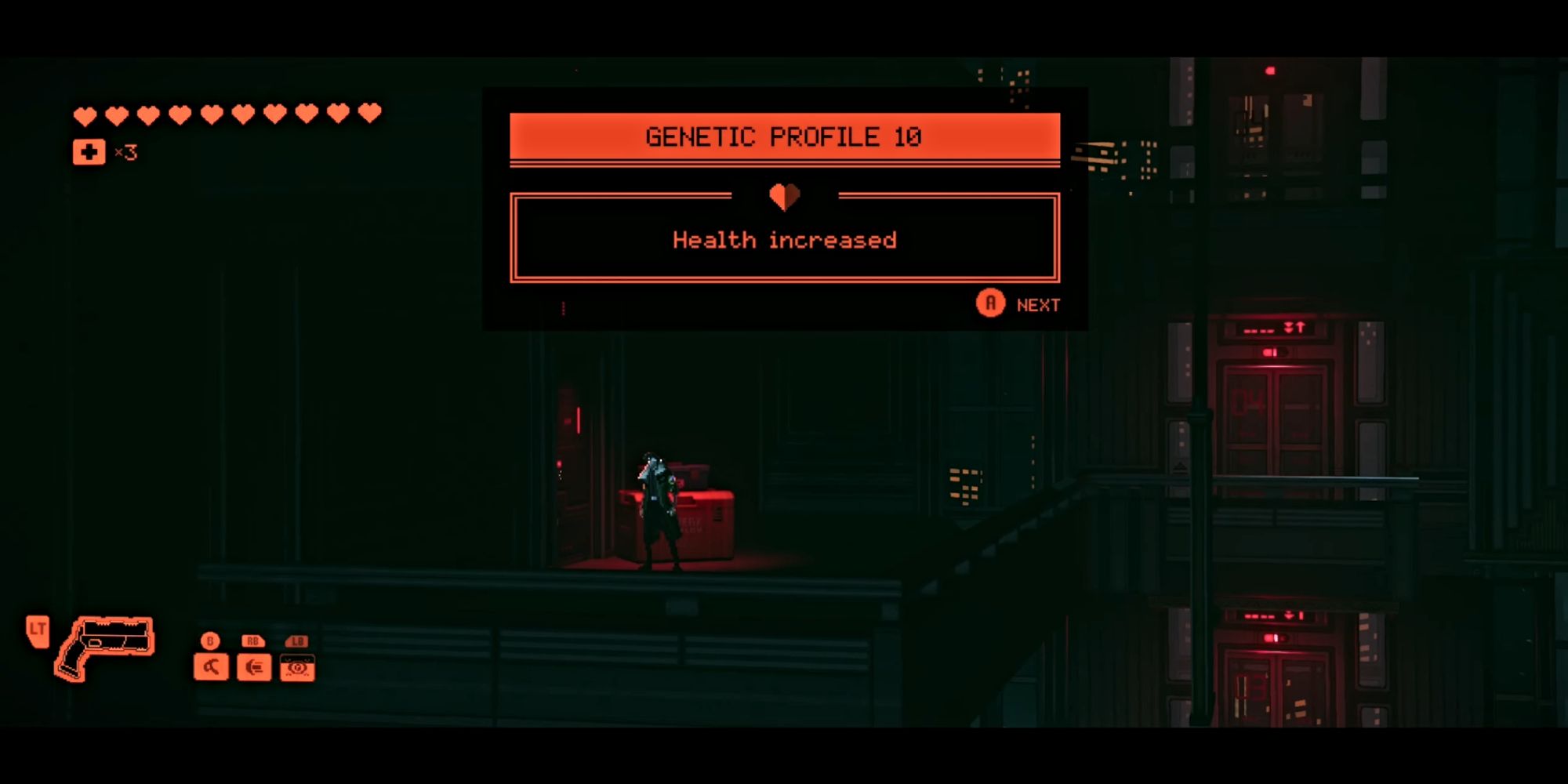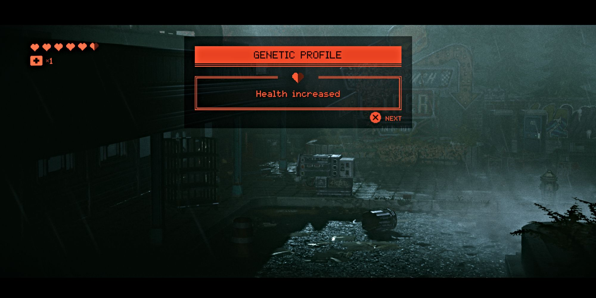 Increasing your health gives you lasting improvements to your health bar, shown as red hearts at the top-left of your screen. Each upgrade typically adds half a heart, and these are called ‘Genetic Profiles’ in the game.
