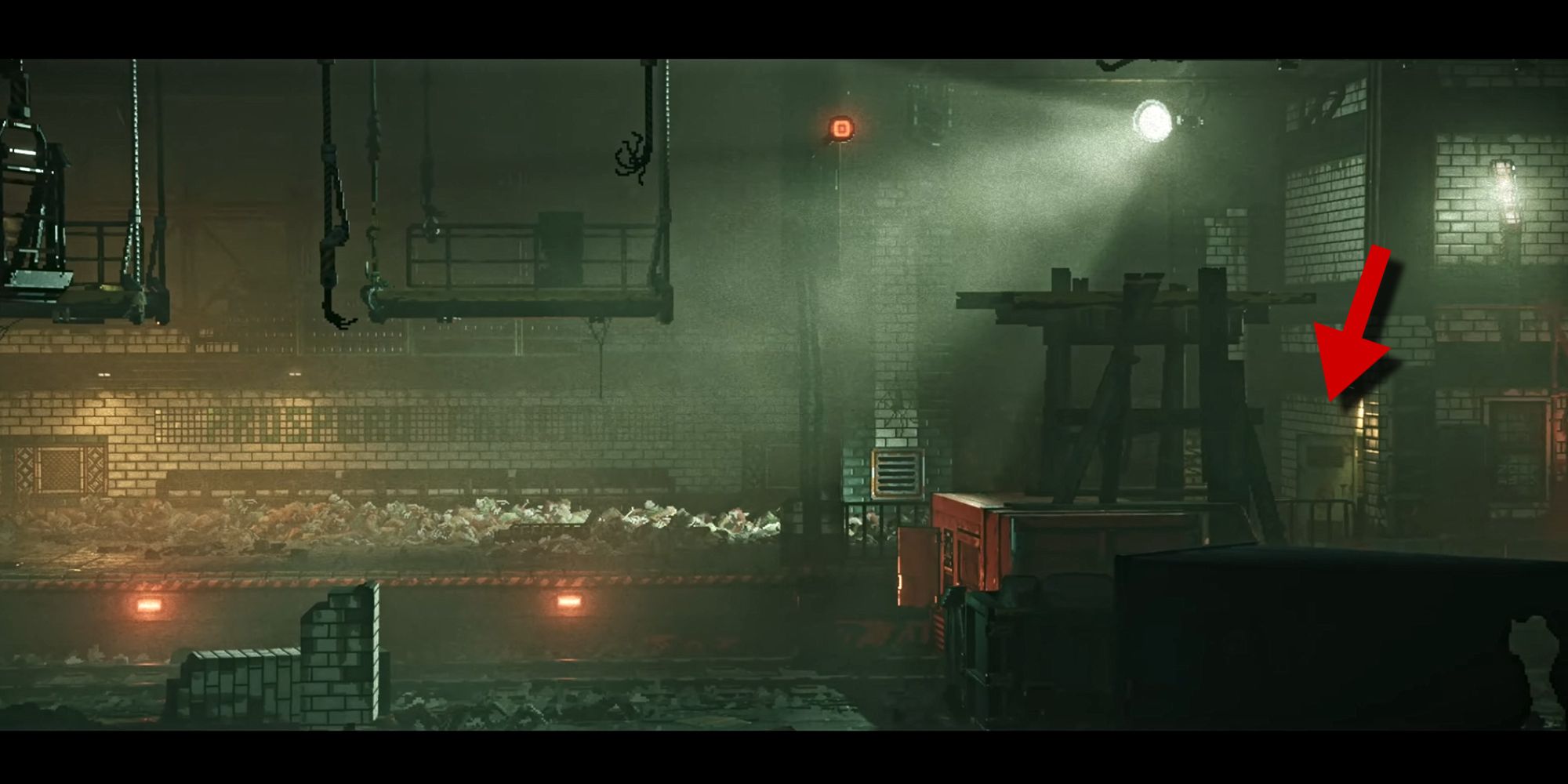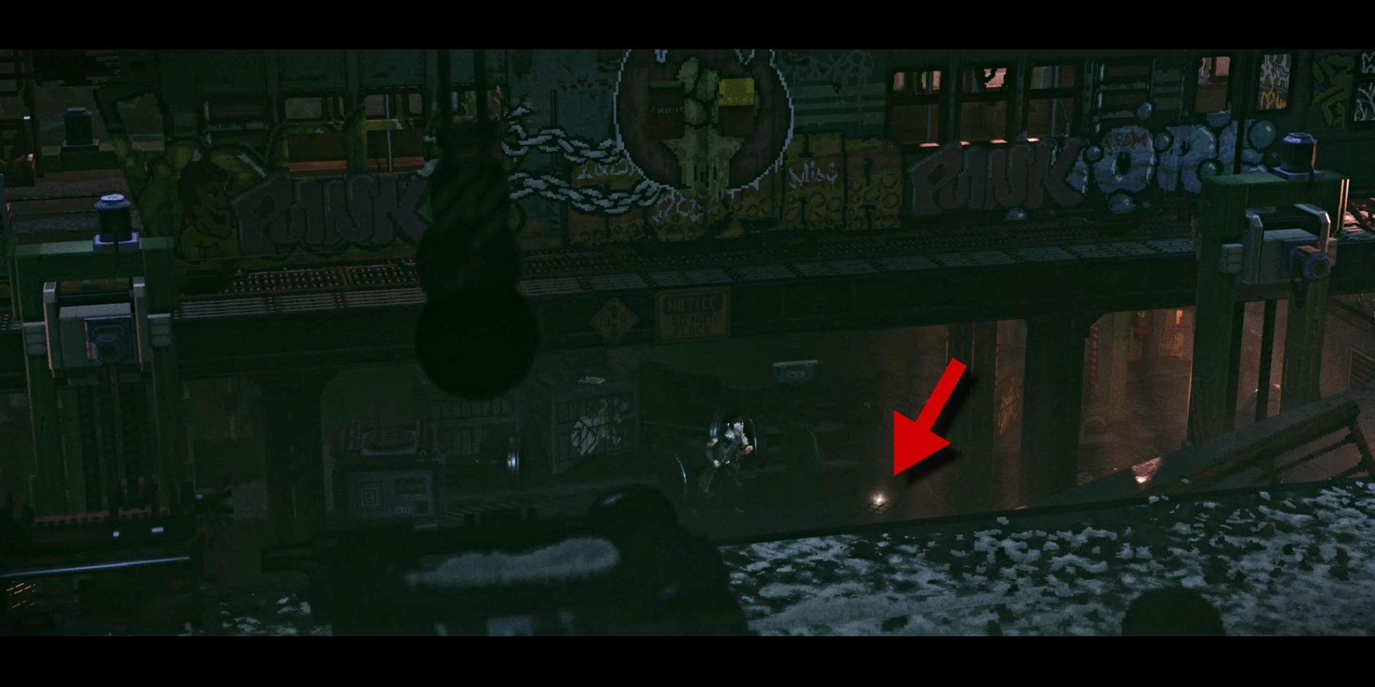 This upgrade is found on the ground beneath an elevated platform with an abandoned train car.