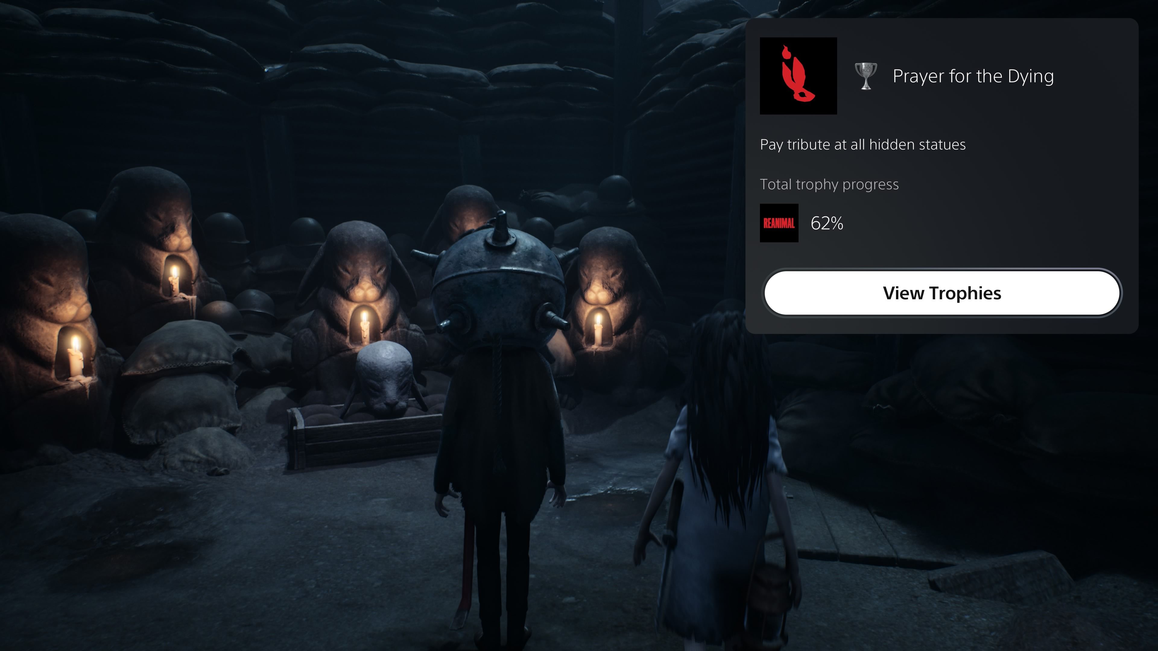 As you progress, you’ll find five rabbit statues. If you manage to light them all up, you’ll immediately unlock the “Prayer for the Dying” Trophy/Achievement. You can also find the Rabbit Statue mask in a box nearby.