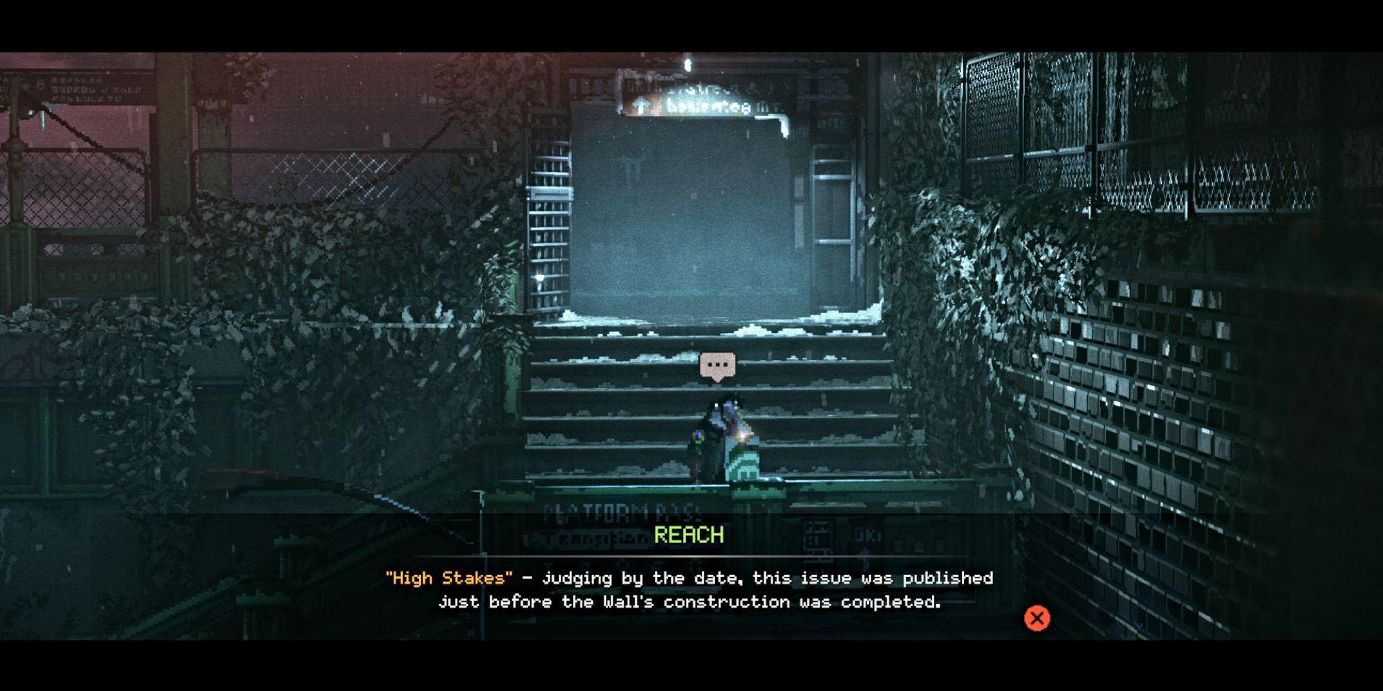 The latest issue of Tempest-Man is hidden on the right side of the main street, on a ledge about halfway up the stairs leading to the train platform. We remember this one being called “High Stakes.”