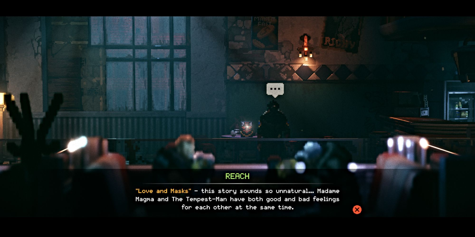 You can find one of the Tempest-Man comics in the station’s diner, right near the counter where the bartender works. We found the “Love and Masks” issue there.