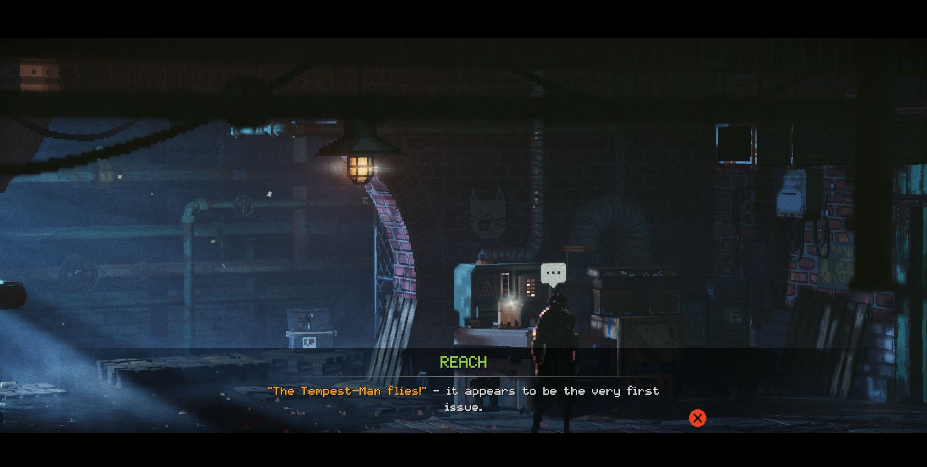 You can find a Tempest-Man comic on a crate in the back of the arcade, in the dark room just to the right of Susan and the games. We discovered an issue called “The Tempest-Man Flies.”