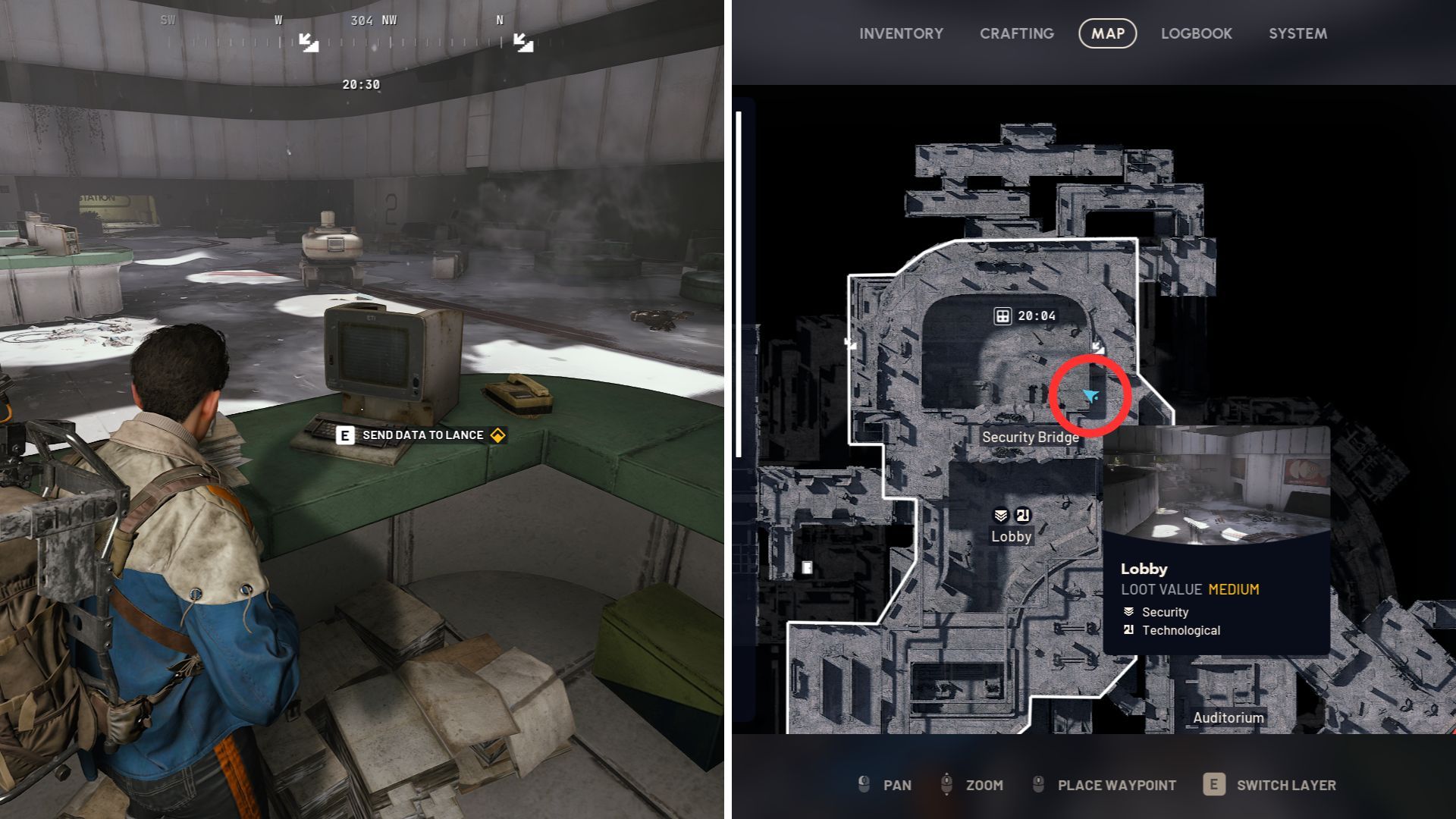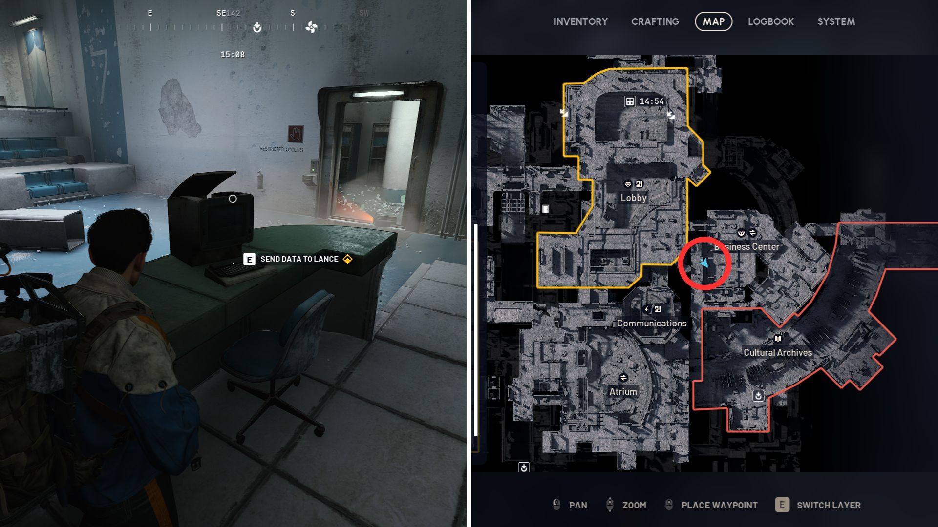 Start by going to the main Lobby area and taking the elevator down to the ground floor (also known as the First Floor). In the northeast corner, right past security, you’ll find a small kiosk. Inside, there’s a computer you can use to send data to Lance.