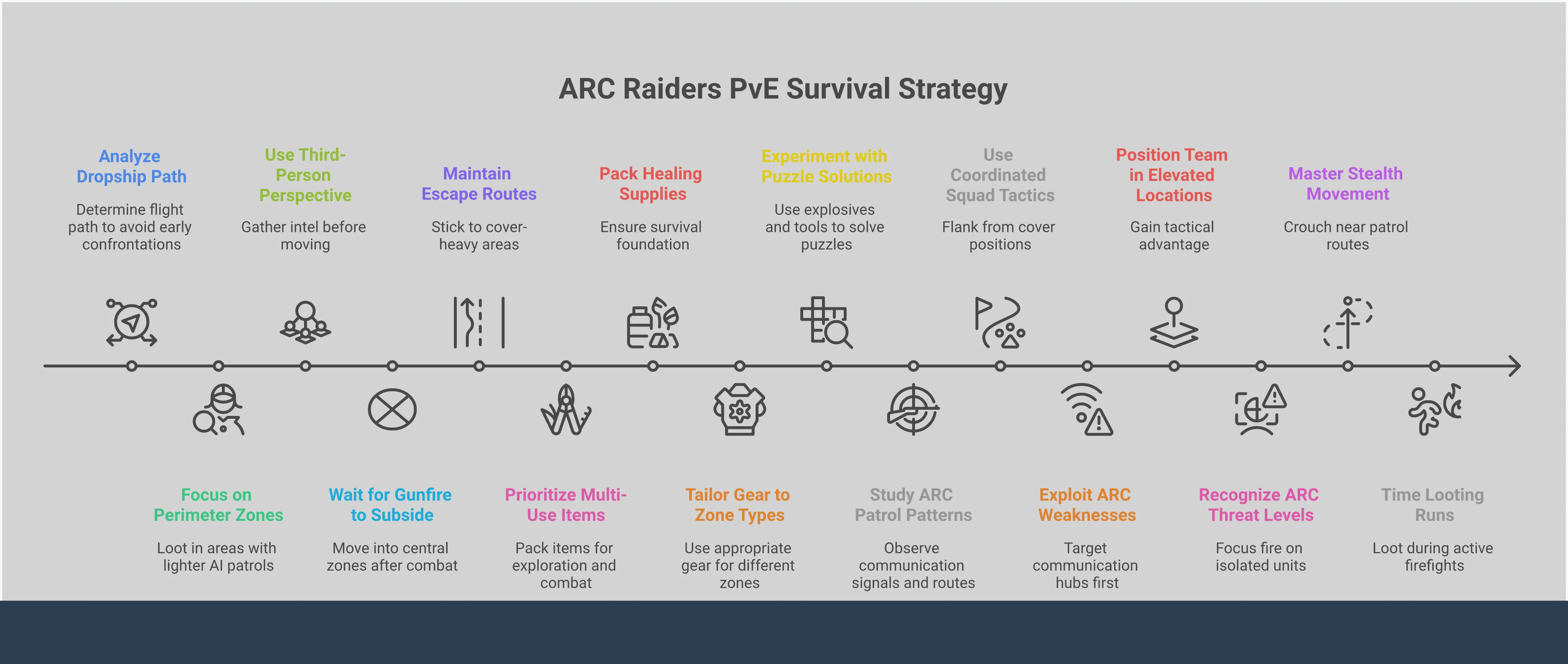 Staying alive in ARC Raiders depends on paying close attention to your surroundings. Staying low, using cover, and moving carefully along the sides of open areas or roads will help you avoid both other players and the AI enemies. The AI isn’t simple – you can learn how they behave to figure out where they’ll patrol and which ones are protecting important loot. Use this knowledge to your benefit: let patrols go by before you act, and always plan an escape. Stealth isn’t just about hiding; it’s about collecting information to move around the world without being seen or challenged.