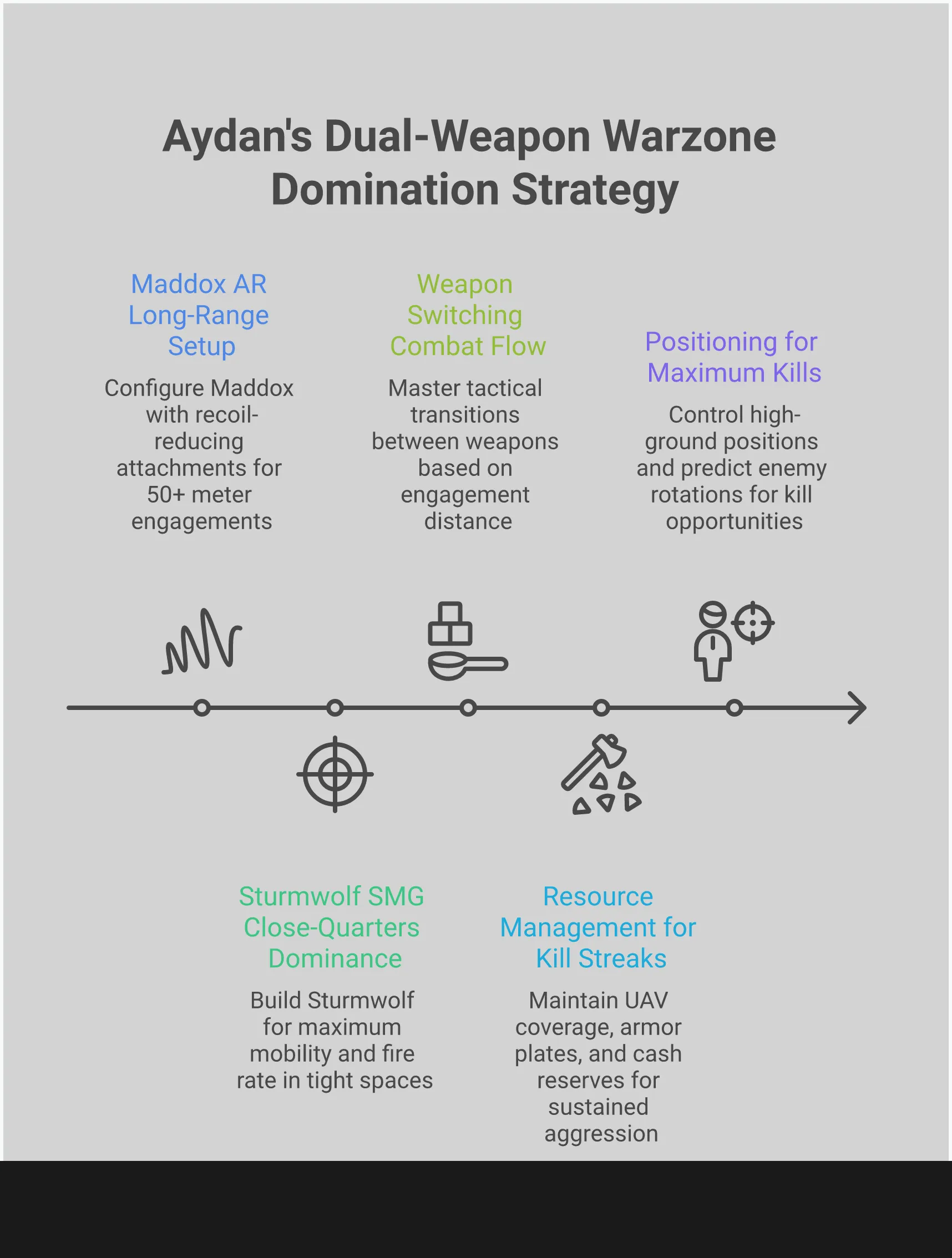 If you’re new to this setup or find the Maddox hard to control, don’t worry about copying it perfectly. The main goal is to have a weapon for long-distance fights and another that’s strong up close. You can easily switch the Maddox for an easier-to-use assault rifle like the SVA 545 or MCW. This will help you hit more shots from far away as you learn the best places to position yourself. Aydan emphasizes that you should use weapons you’re comfortable with. Before trying to play aggressively like him, focus on getting good with the current popular weapons that are both powerful and easy to handle.