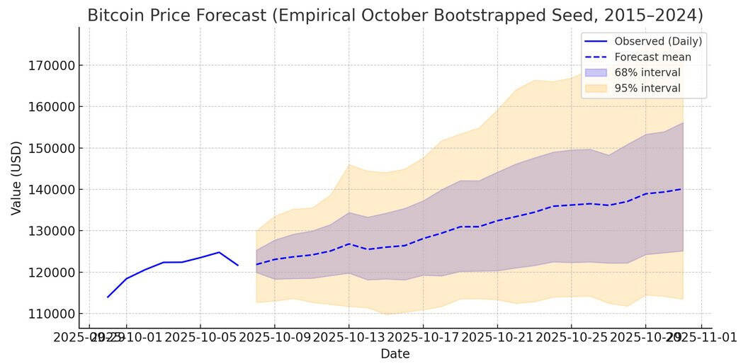 According to economist Timothy Peterson’s decade-long simulations, there’s a 50% chance Bitcoin will finish the month of October above $140,000.