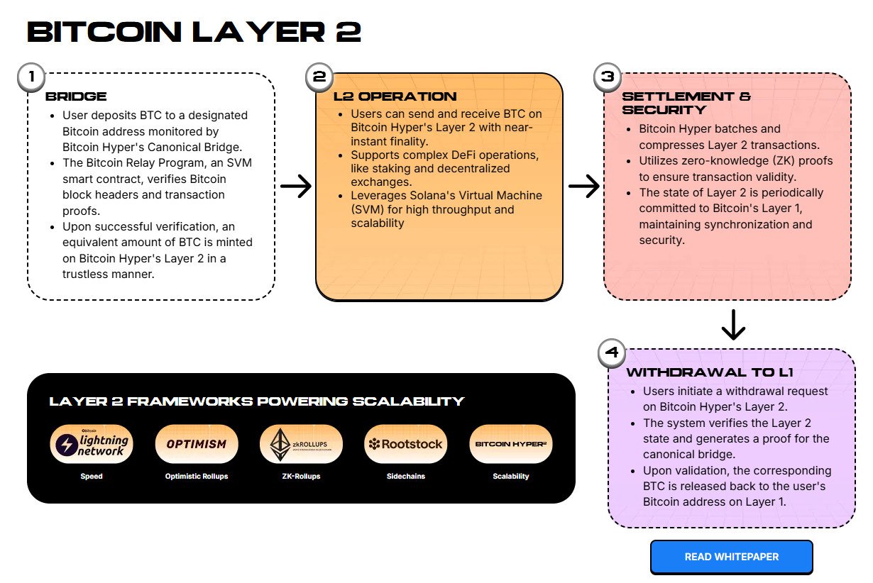 Bitcoin Hyper ($HYPER) is a system built on top of Bitcoin, designed to make transactions faster and cheaper. It uses technology from Solana to achieve quick, low-cost transactions and allows for more complex applications like decentralized finance (DeFi), apps, and even meme coins. Importantly, it still relies on the strong security of the original Bitcoin blockchain.