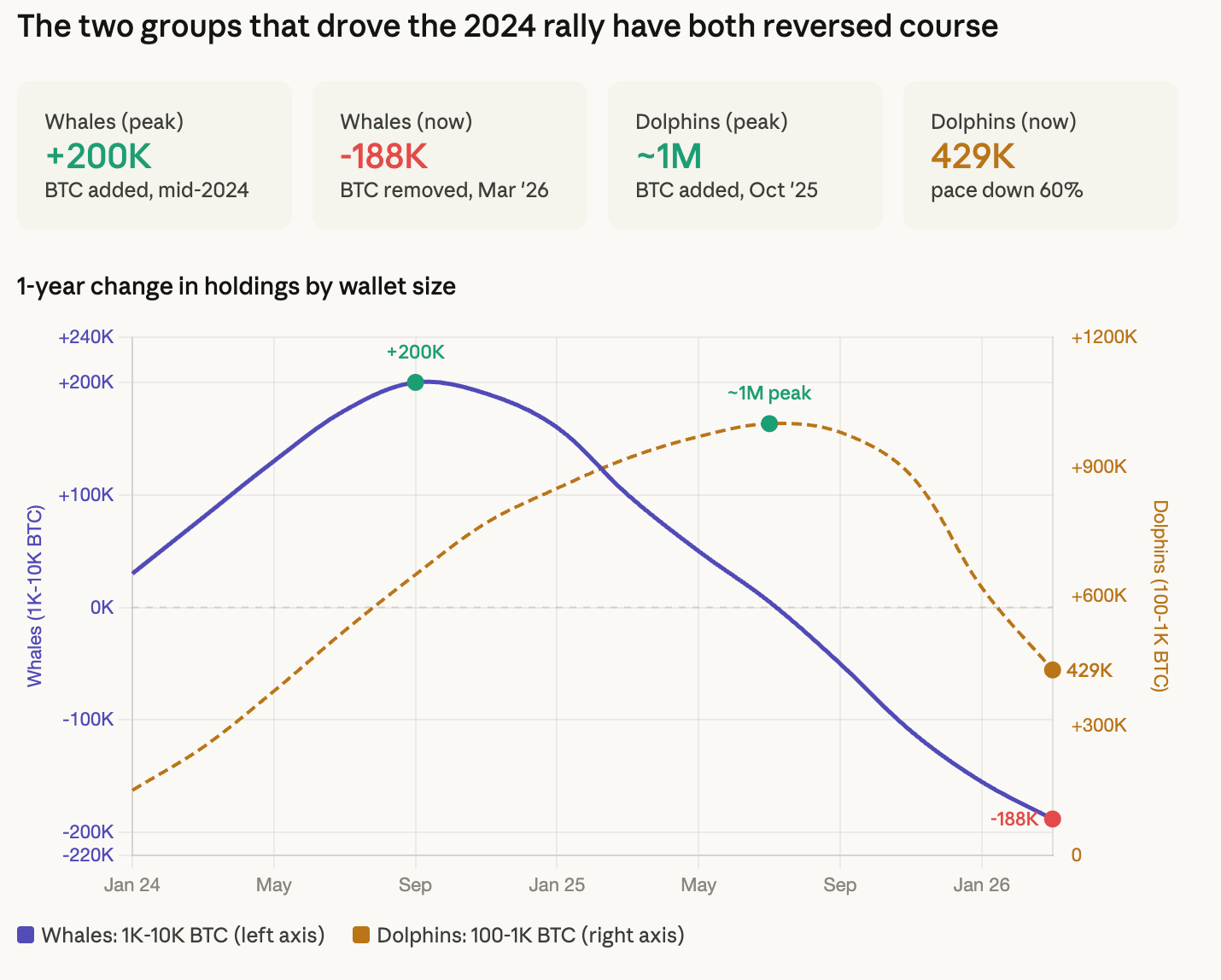 Mid-tier holders are still buying, but at a snail’s pace. They’ve slowed down more than 60% since October 2025. It’s like they’re dipping their toes in the water, but not ready to dive in.