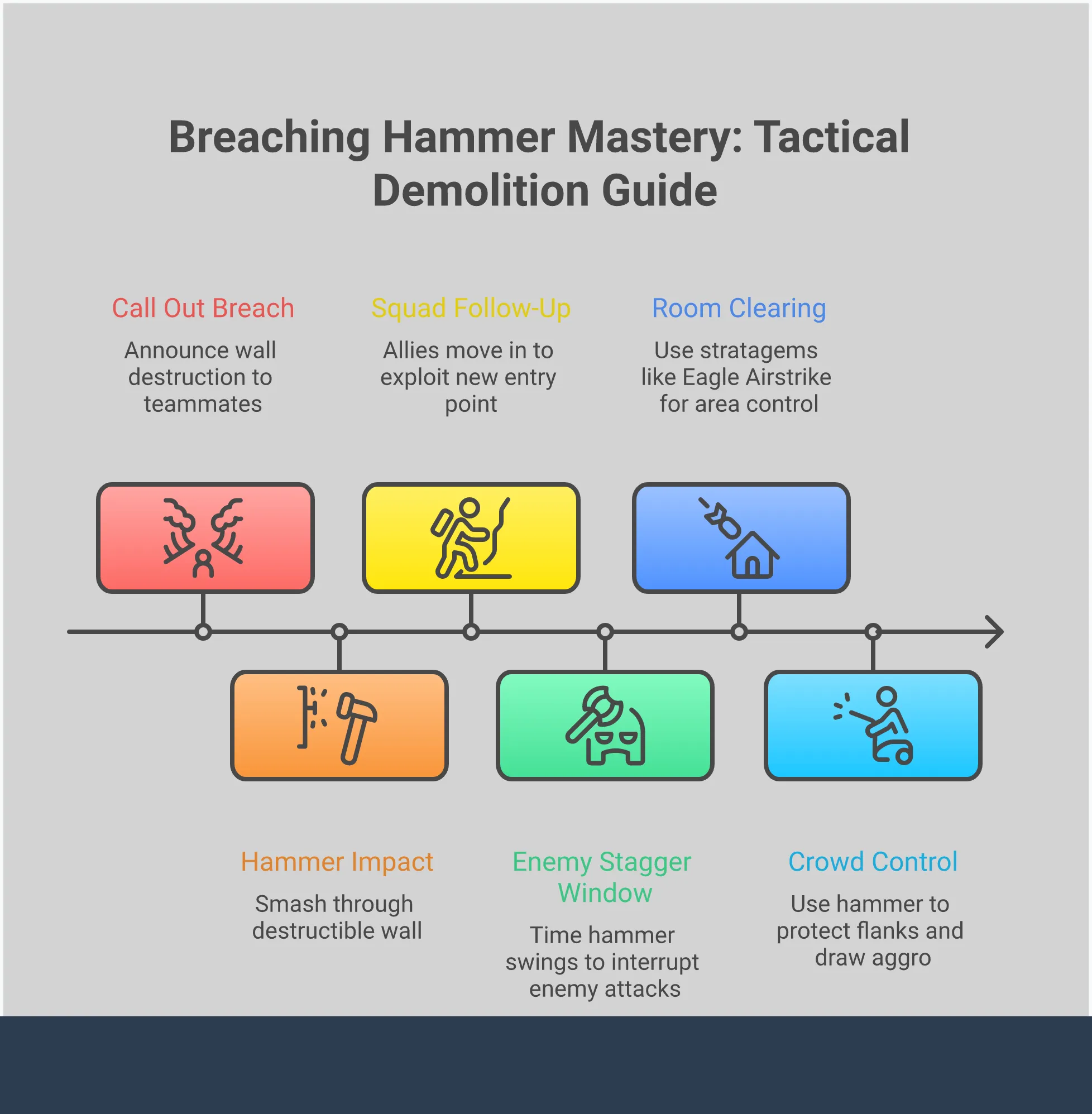 The Breaching Hammer is powerful, but it’s most effective when used as part of a team. While swinging it can leave you vulnerable, its strength lies in setting up opportunities for your teammates. Combining its destructive force with coordinated fire from your squad creates an overwhelming attack. It’s about transforming raw power into a smart, team-based strategy that completely overwhelms the enemy.