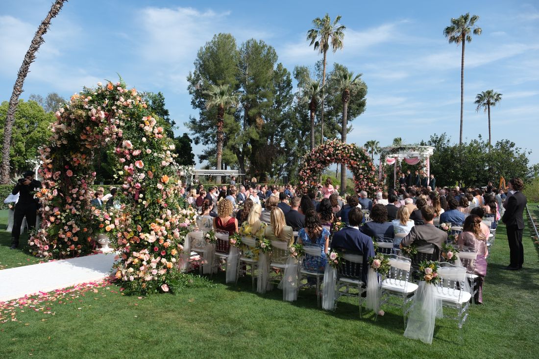 To keep the flowers fresh during the reception, the entire sound stage at Warner Bros. was cooled to below 67 degrees. It was summer, and as event planner Audouy explains, she was worried the flowers would wilt if the temperature soared. She even installed a thermostat to constantly monitor it! The flowers came from all over – Southern California first, then Miami, Amsterdam, and Ecuador – because they quickly ran out locally. “We essentially bought every flower available,” Audouy says.