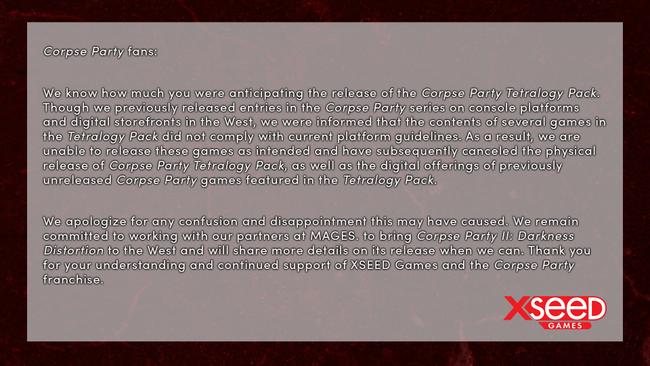 We’re sorry for any frustration or disappointment this has caused. We’re still working with MAGES. to release Corpse Party II: Darkness Distortion in Western regions and will share updates as soon as we have them. Thank you for your patience and continued support of XSEED Games and the Corpse Party series.