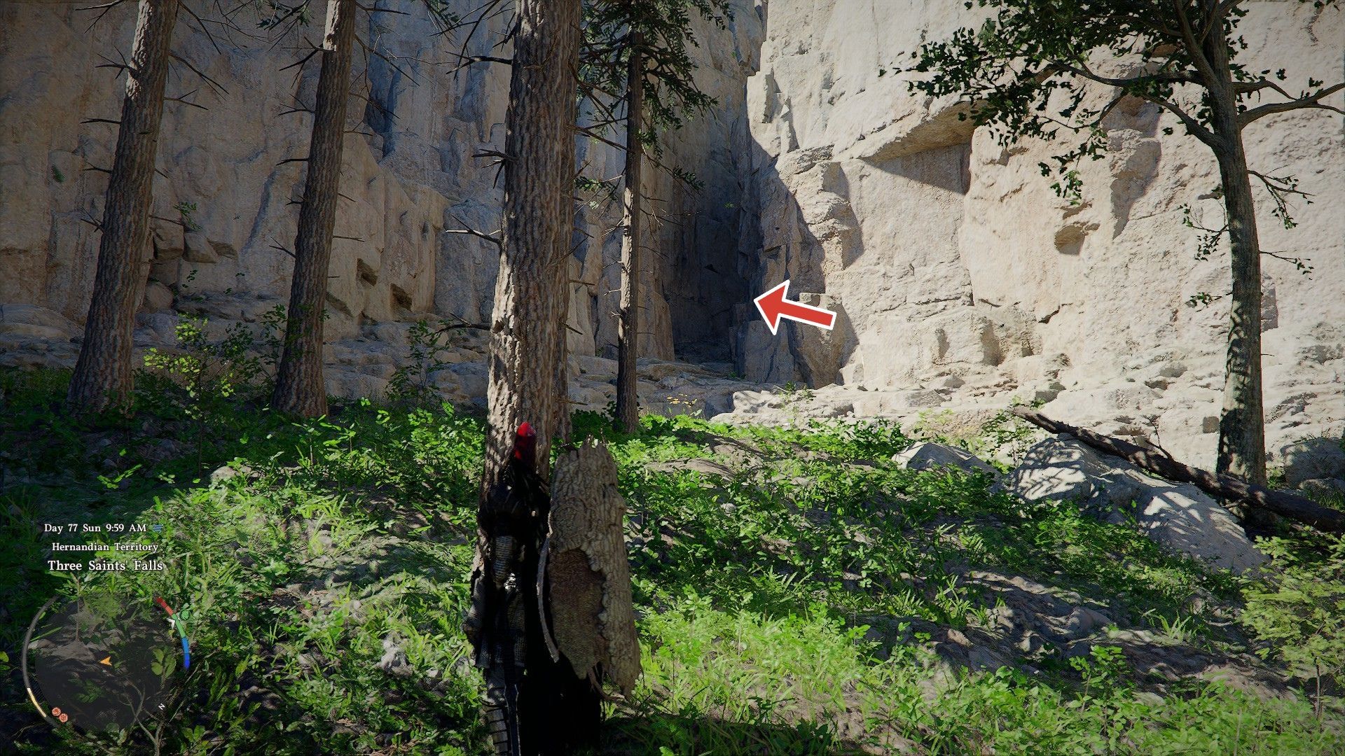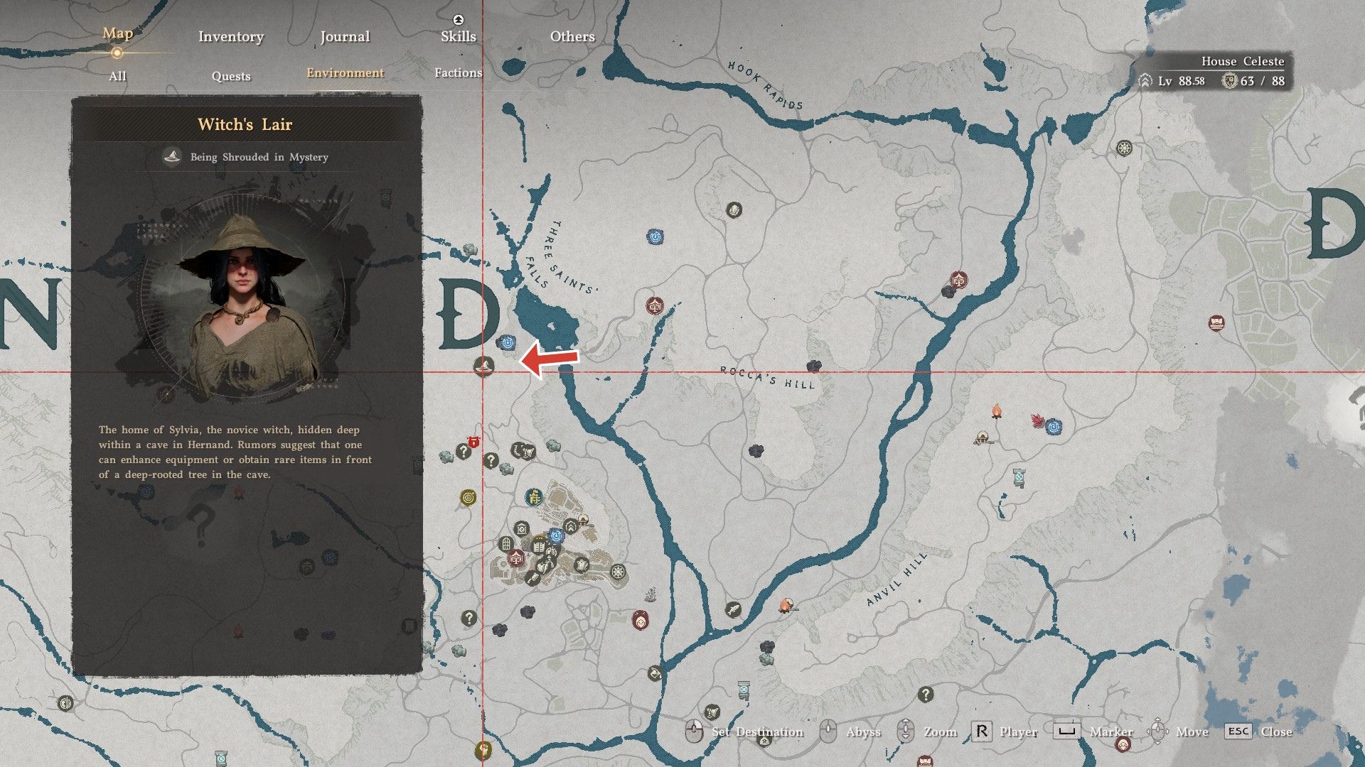 You can find the Hermit Witch early in the game, but she’s easy to miss! She’s hidden in a cave north of Hernand city. Head to the location shown in the image, then search the mountainside to find her.