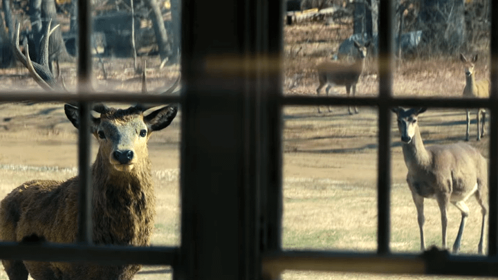 The animals are behaving very strangely, unlike anything you’d normally see. For instance, around the 5-second mark, a group of deer are seen standing outside a house, all staring directly at the character played by Josh O’Connor who is inside.