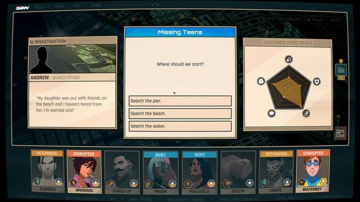 There doesn’t appear to be a time limit, so my advice is to pause between each section or mini-game to give the team a chance to rest. Each area of the city opens up new investigations, and we should explore them from left to right.
