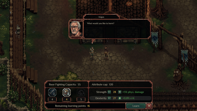 These trainers let players use learning points to boost either their Strength or Dexterity stats, or to learn skills like Basic Swordfighting or Lockpicking. Each weapon type – Swords and Shields, Spears, Axes, or Daggers – feels quite different to play, and learning points are limited. This means you can’t become an expert in everything, so players need to focus on a particular weapon early on. Luckily, the game later lets you reset your learning points, so you’re not stuck with your initial choices forever.