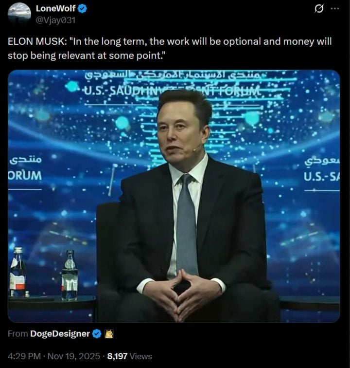 During the 2025 U.S.-Saudi Investment Forum, Elon Musk discussed the latest advancements in AI, robotics, and the future of technology. He highlighted Tesla’s humanoid robots, their plans for self-driving robotaxis, and his broader ideas about automation. A clip of him stating that “the only real path to widespread wealth is through AI and robotics” circulated online, and Musk subsequently shared it himself.