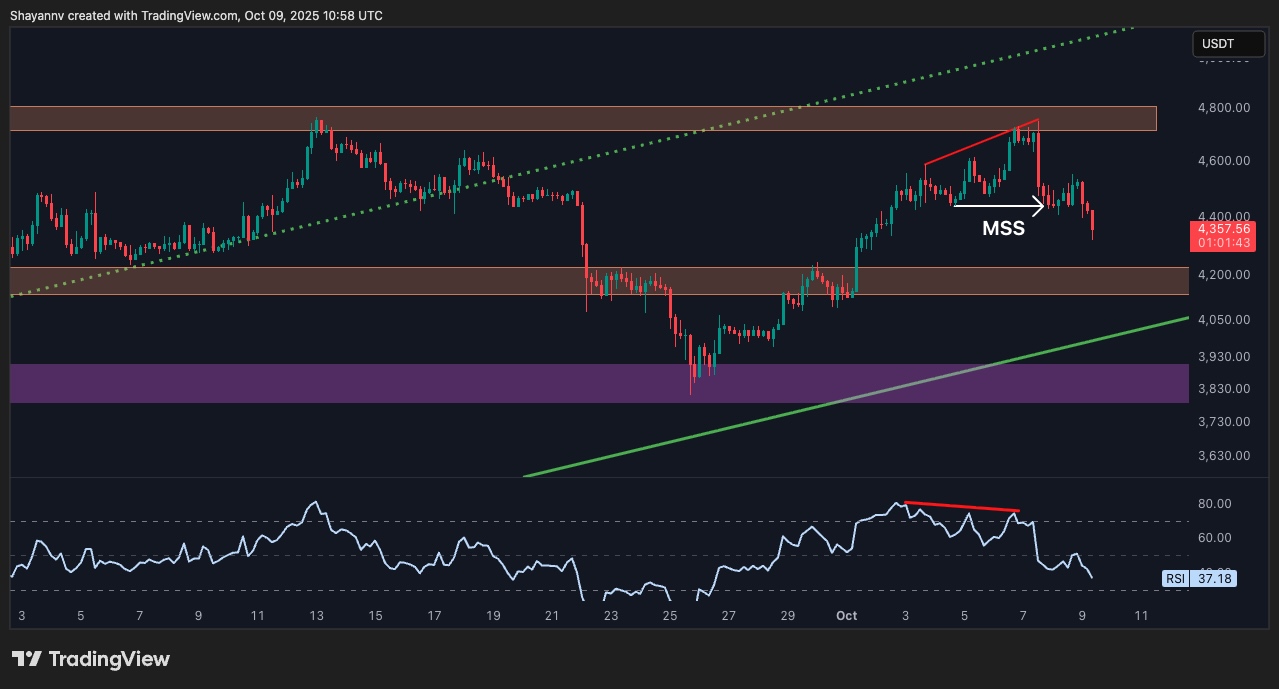 In the labyrinth of the financial Gulag, Ethereum’s once-mighty march has stumbled, its boots mired in the mud of resistance at the $4,400 threshold. The air, thick with the scent of speculative greed, now carries a chill as the bullish fervor wanes. Like a prisoner’s hope in the dead of winter, the short-term momentum has frozen, betrayed by a local bearish divergence and the cruel shift in market structure. Yet, the mid-term uptrend, a stubborn sentinel, still stands guard, though its resolve is tested.