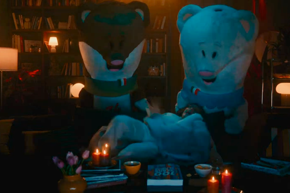 Not Sabrina Impacciatore being menaced by the first openly Gen-Z Olympic mascots