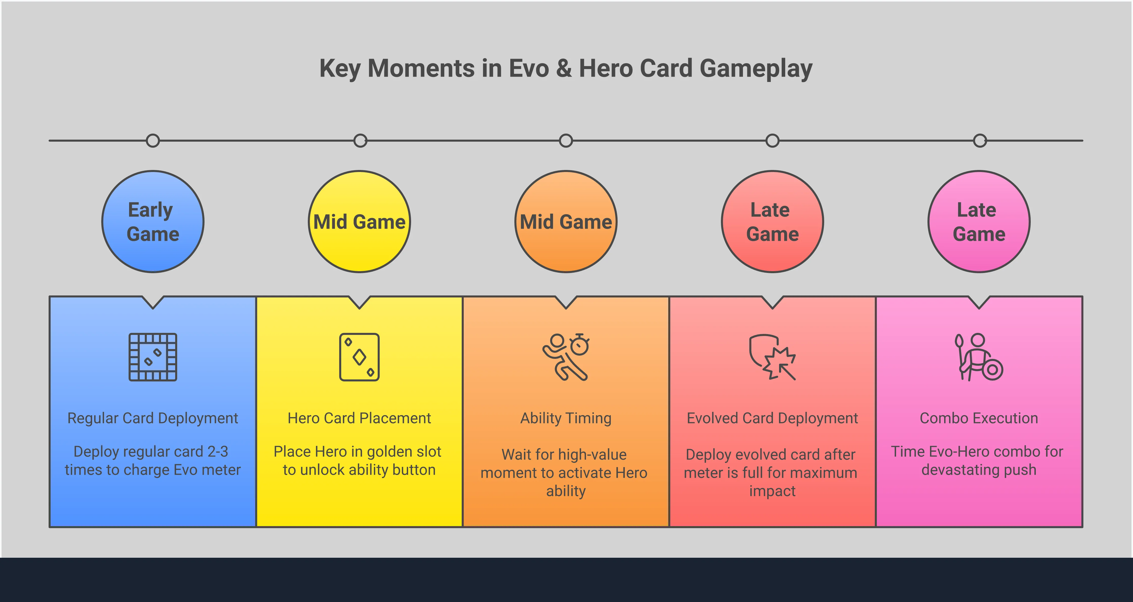Managing your resources effectively is crucial, both when building your deck and during matches. Players have found that Evo cards take time to become truly powerful, while upgrading Heroes can give you a quick advantage. This creates a key decision: do you spend resources to boost a Hero for immediate strength, or invest in an Evo card that could become a game-changer later on? The best choice depends on whether you need to control the early part of the match or finish strong at the end. Consider how quickly you want to gain an advantage and choose cards that give you the most value for your investment.