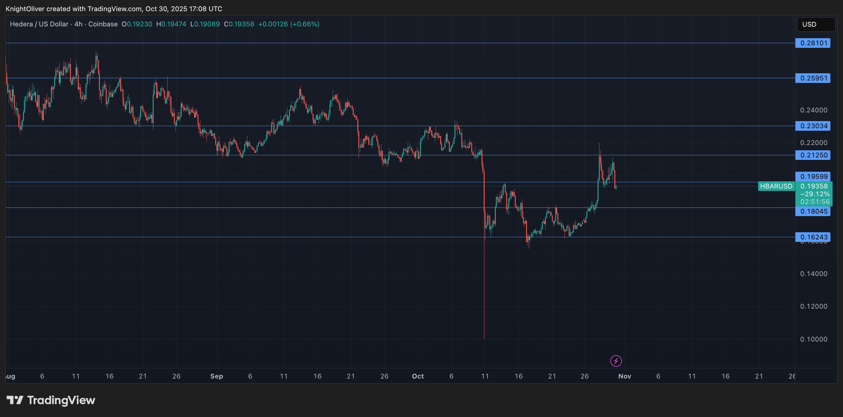 Hedera’s native token, HBAR, fell 3.25% to $0.1925 over the 24-hour period ending October 30, despite the launch of its first U.S.-listed exchange-traded fund. Because what’s a token without a little drama? 💸