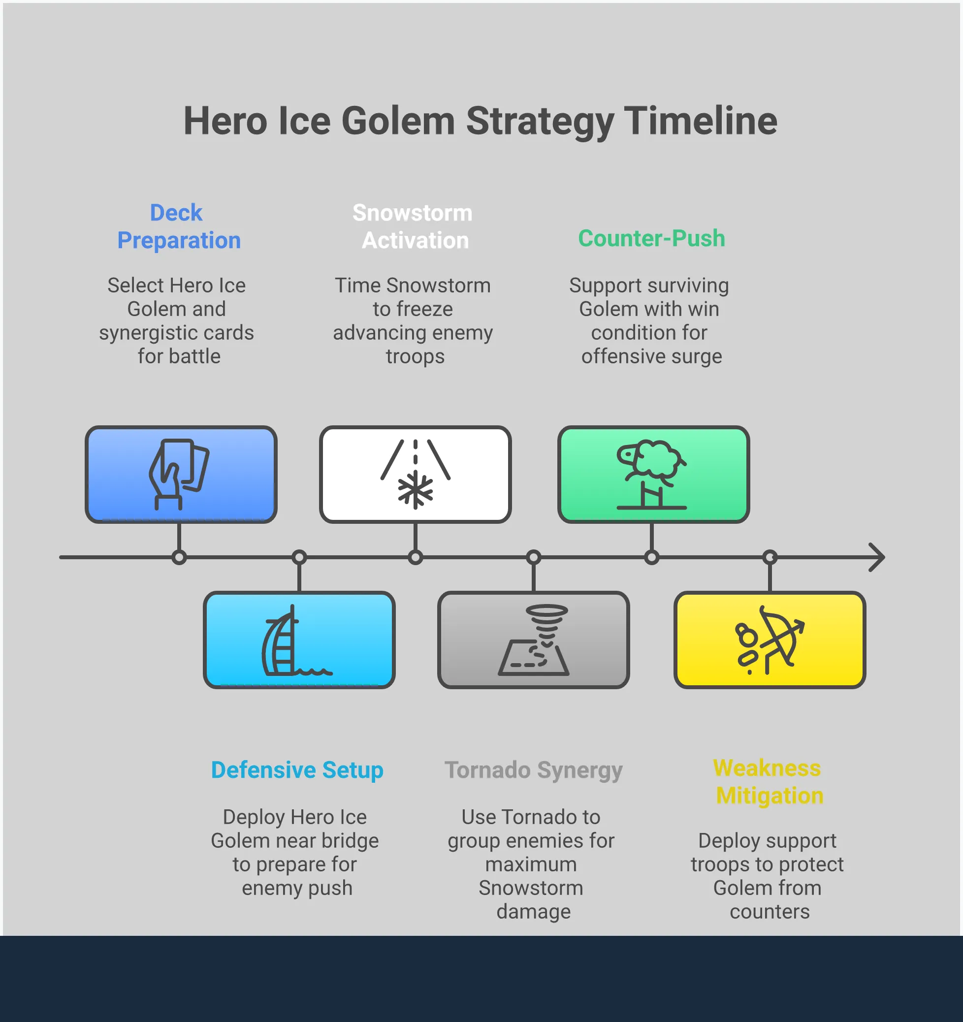 The Hero Ice Golem isn’t about overwhelming power—it’s about smart play. It’s not meant to destroy towers on its own, but to control the battlefield and give you an edge. When used well, it can disrupt your opponent’s strategy and create opportunities for attack. Think of it like a chess piece that dictates the pace and controls key areas. It protects your other troops by soaking up damage, diverting enemy attacks, and slowing down their advances with its Snowstorm. This allows your damage-dealing cards to work effectively. The Hero Ice Golem is great at turning a tough defense into a powerful counterattack, making it a vital part of many successful defensive decks. Let’s explore the specific strategies to help you maximize its potential.