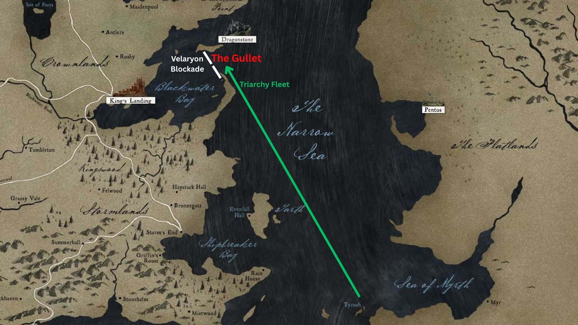 This naval battle is a key event in the Dance of the Dragons, directly linked to Rhaenyra’s blockade of King’s Landing. Rhaenyra, utilizing the strong Velaryon fleet, has stopped supplies from reaching the city, causing hardship for the people. Tyland Lannister has gone to Essos seeking help from the Triarchy – a group Daemon and Corlys fought against earlier – hoping they will provide ships to lift the blockade for the Greens. A depiction of this struggle is shown below.
