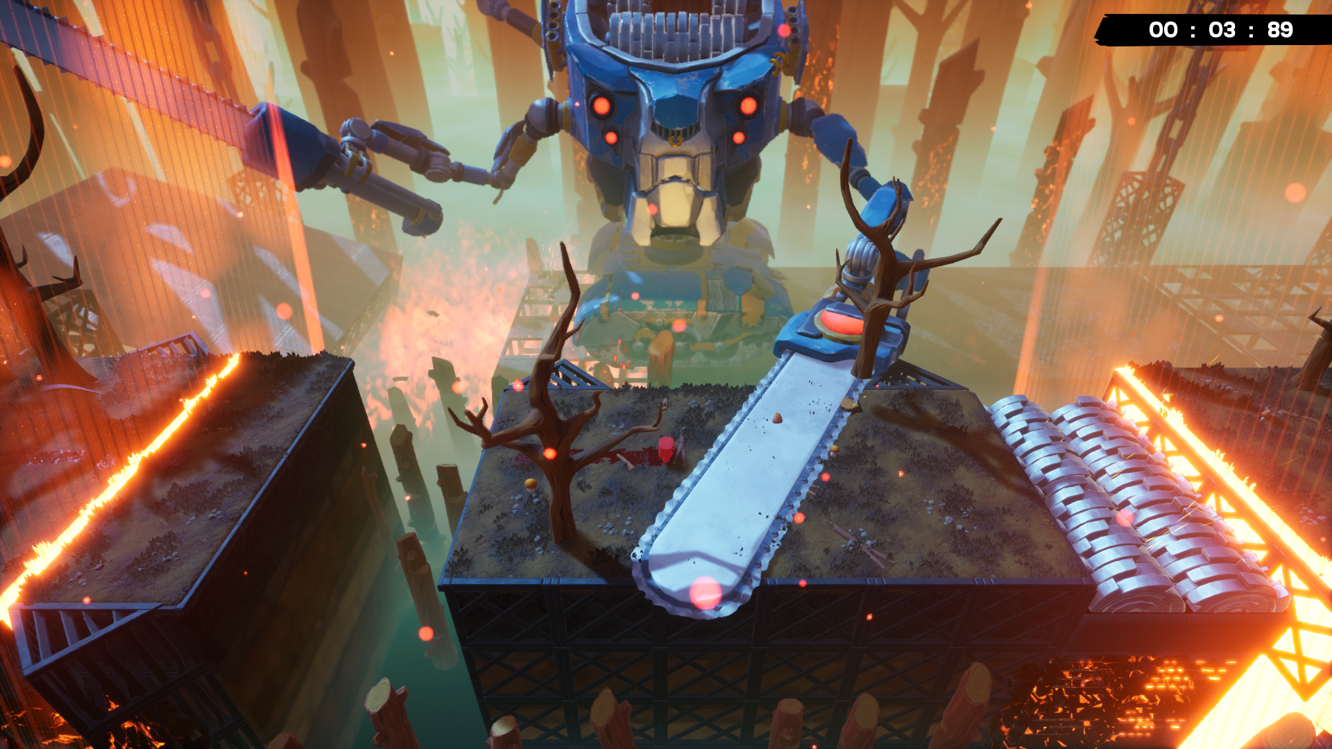 Be careful! The boss’s final chainsaw attack hangs in the air above the next platform for a few seconds. Wait for it to pass to avoid getting hit.