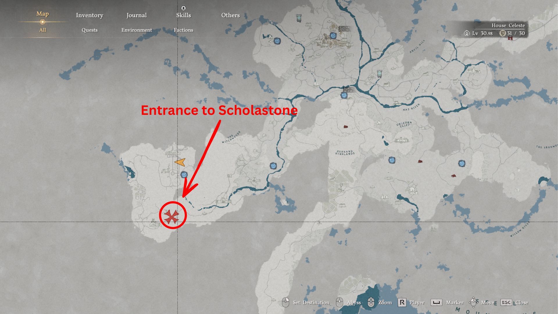 Your next goal is to travel to Scholastone, located southwest of Hernand, close to Fort Perwin. Be careful, as the fort may still be occupied by Bleed Bandits if you haven’t already taken it. Once you’re there, you can also unlock a fast travel point nearby to help you get around more quickly.