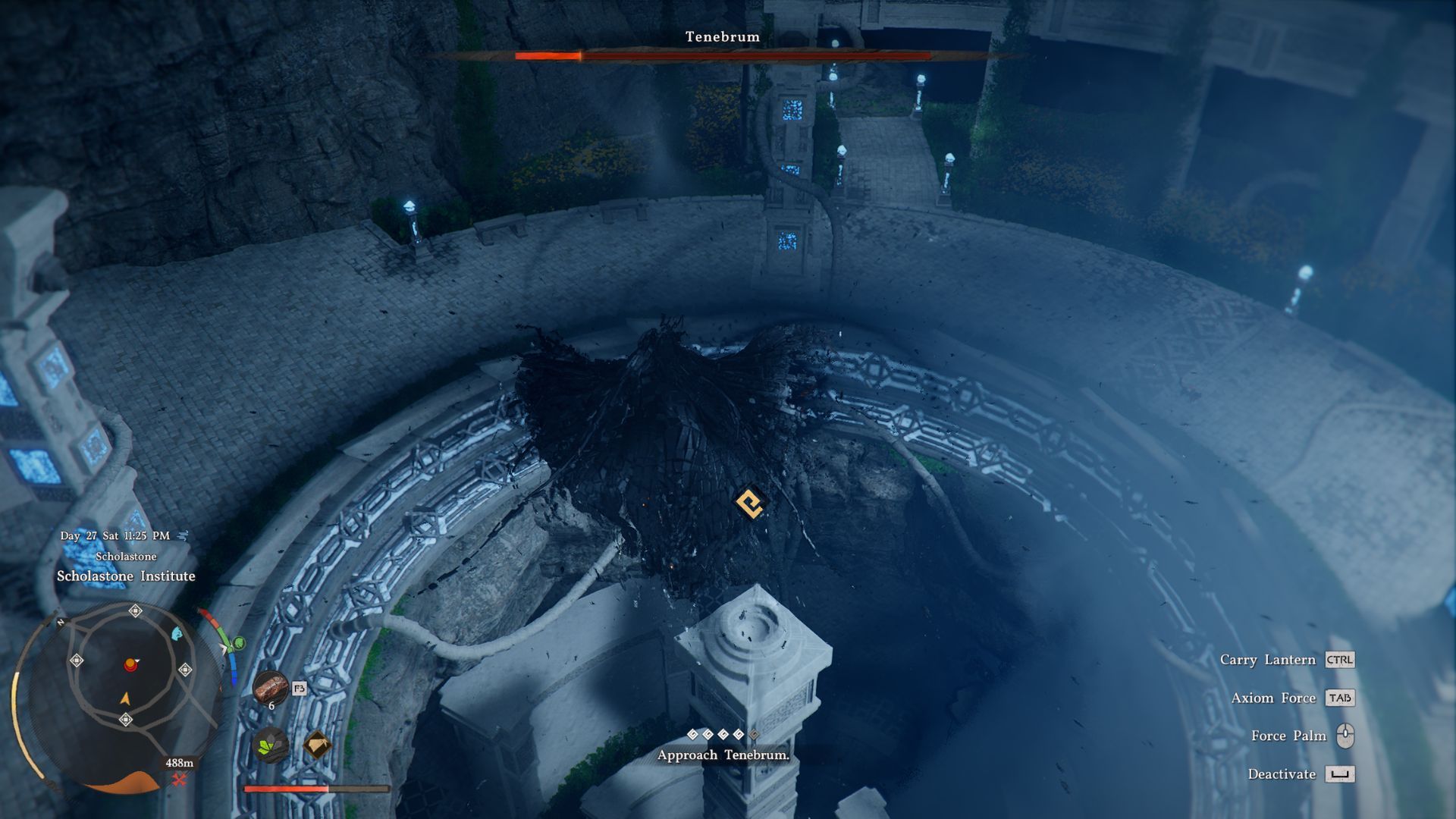 Climb to the top of a column, then run and jump towards Tenebrum, gliding as you go. As you approach, use your Force Palm ability to inflict significant damage.