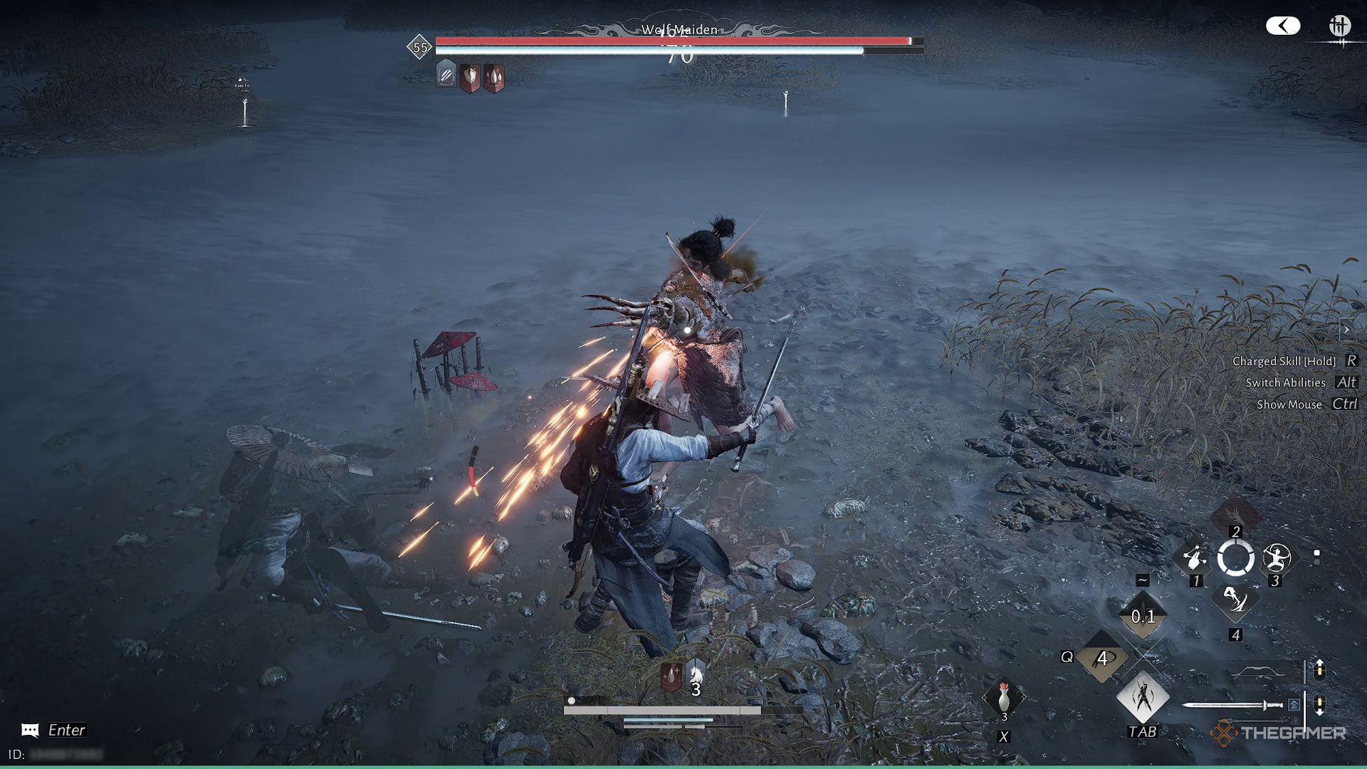 The Wolf Maiden attacks by swinging her weapons and launching silver projectiles at you. If you create enough space, you can deflect these projectiles, which will deal additional Qi damage.