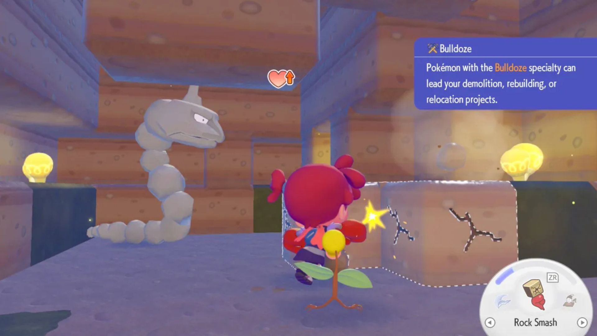 Explore the cave until you find a speech bubble showing someone needs help. Follow the bubble – it will lead you to Onix, who’s stuck behind some incredibly tough rocks that you can’t break.