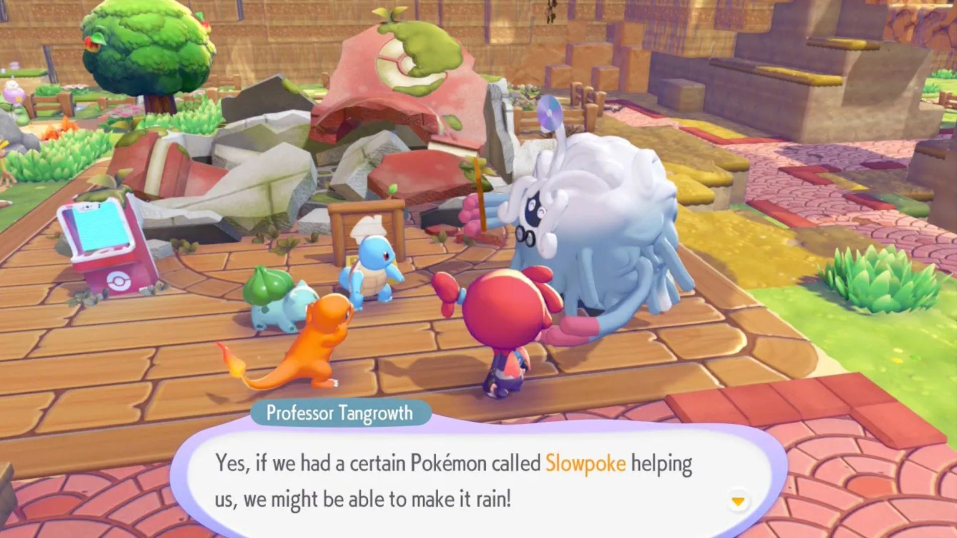 The Pokémon you’ve already caught, like Bulbasaur and Squirtle, can also help make the air more humid when you ask them. Once it’s humid enough, you can use Slowpoke’s Yawn to make it start raining.