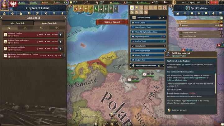I’ve discovered a really cool way to get Casus Bellis! You can use Spies. Basically, you just send them to the country you want to go to war with. Once your Spy Network reaches 20 points, a special Casus Belli option will pop up when you right-click that country – things like starting a war against pirates or a religious war. It’s a sneaky but effective way to justify your wars!