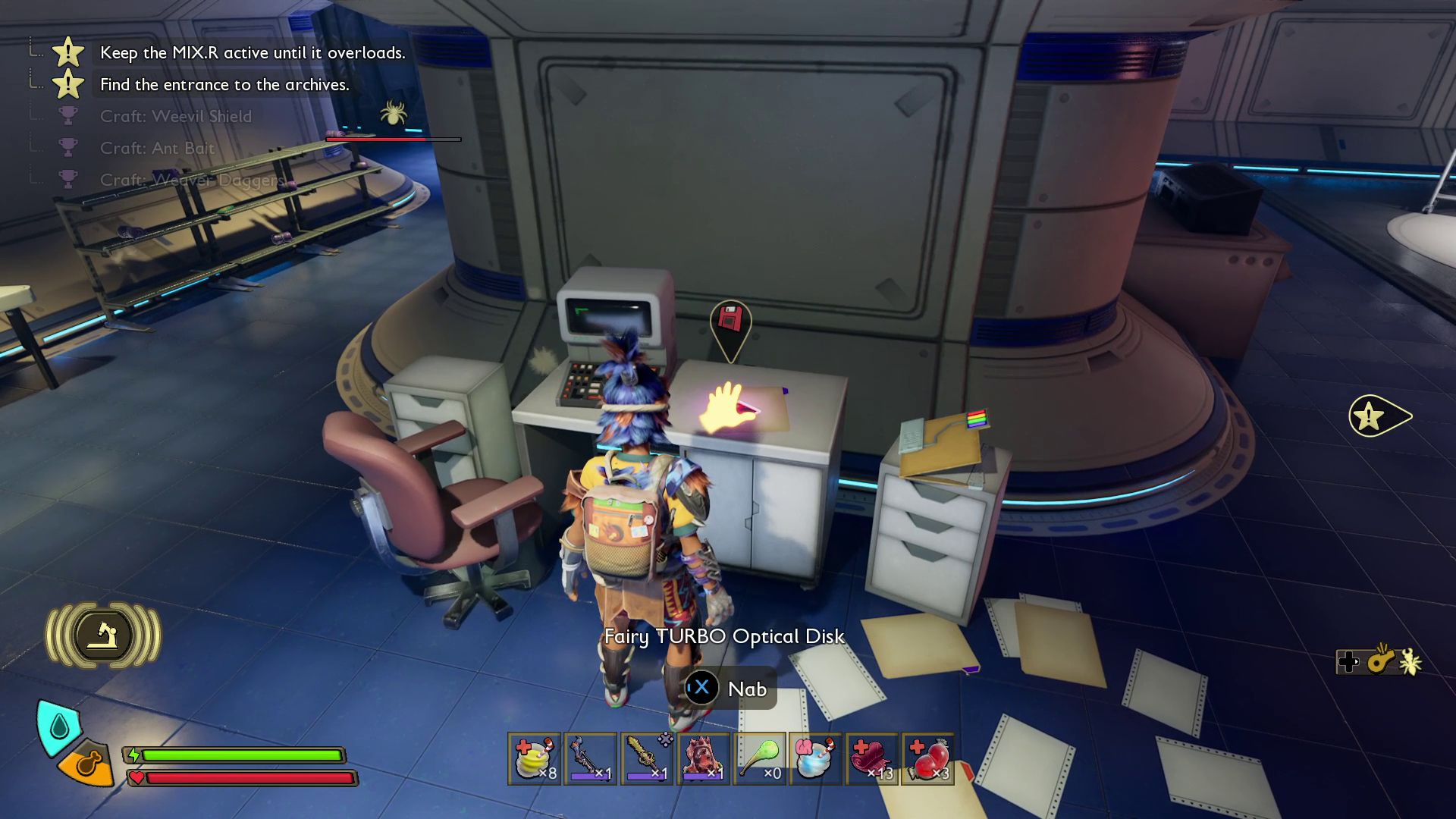 You can find these items in the new area, and you’ll also find a Research Station where you can upgrade your Omni-Axe as you explore. After upgrading, your next goal is to go to the cabbage patch and collect the Turbo Optical Disk.