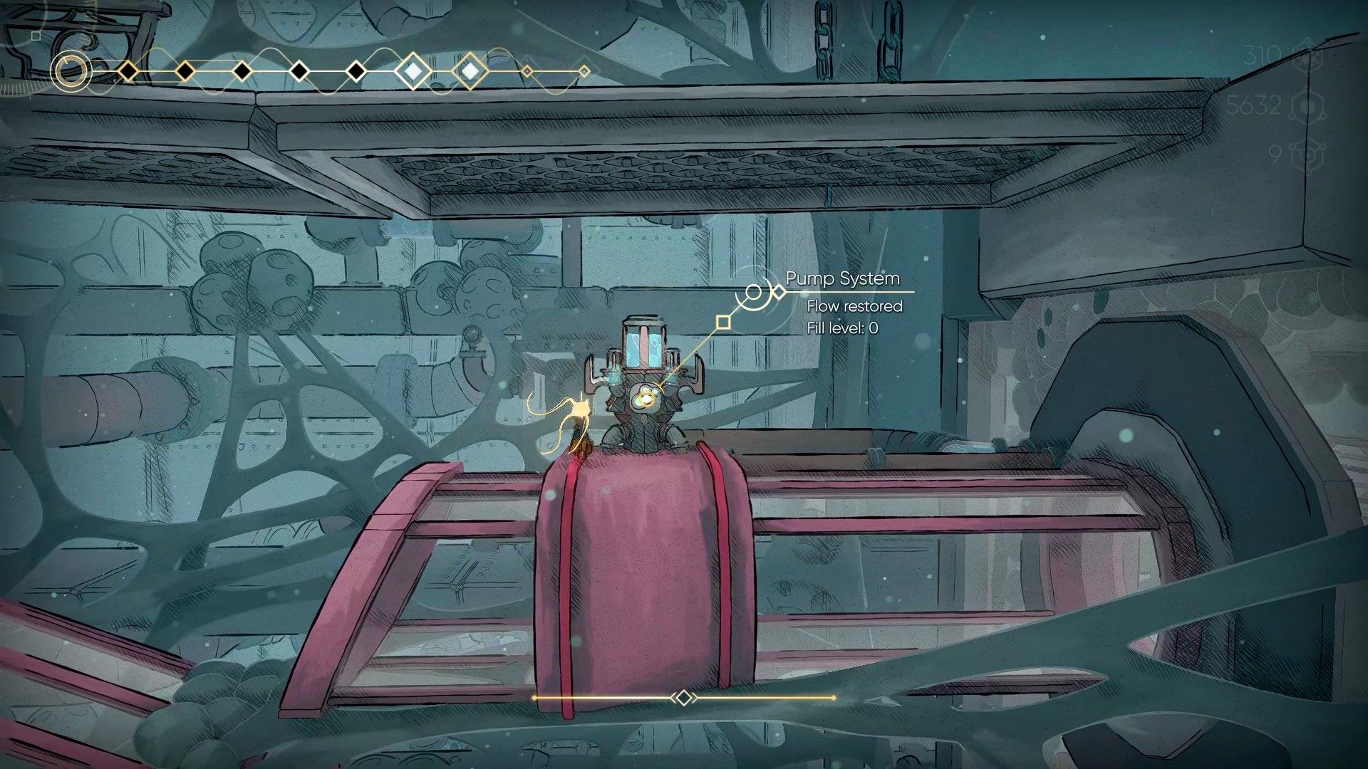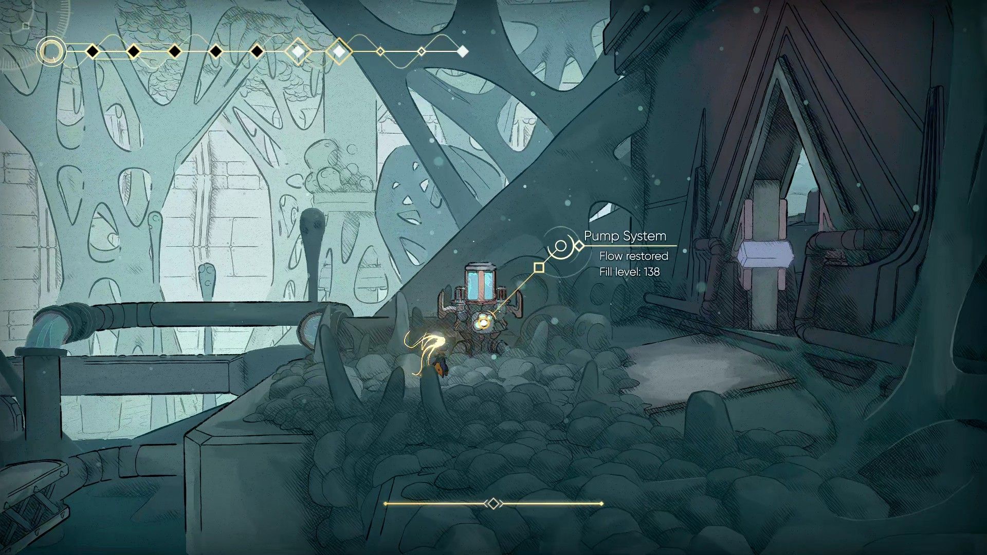 Enter the room and turn left. Continue down this path, and you’ll find the next Gloomwater pump. Turn it on, then head to the right.