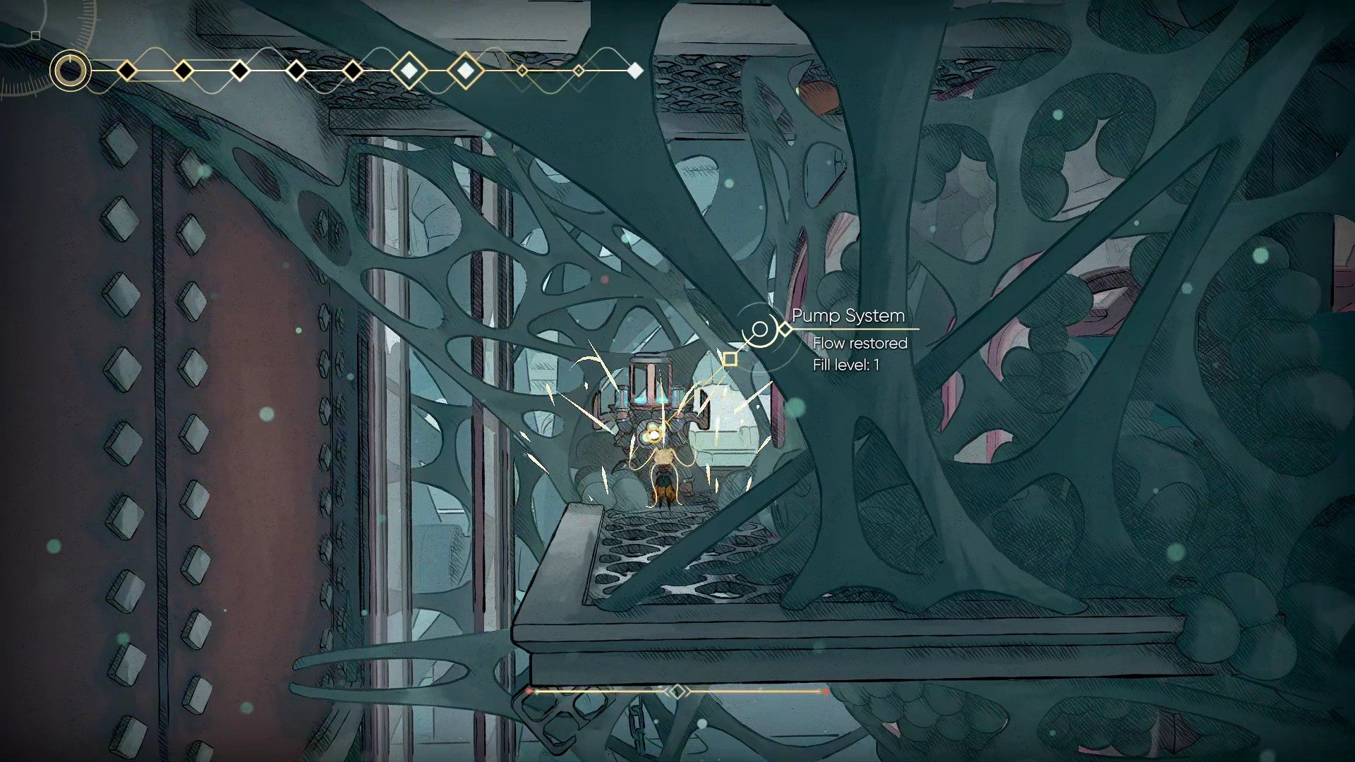 Go down to the area filled with Gloomwater. Then, use your Striders to climb along the ceiling until you reach the metal grates. Climb up the grates to find the pump and activate it. After that, return to the upper level and continue moving to the right.