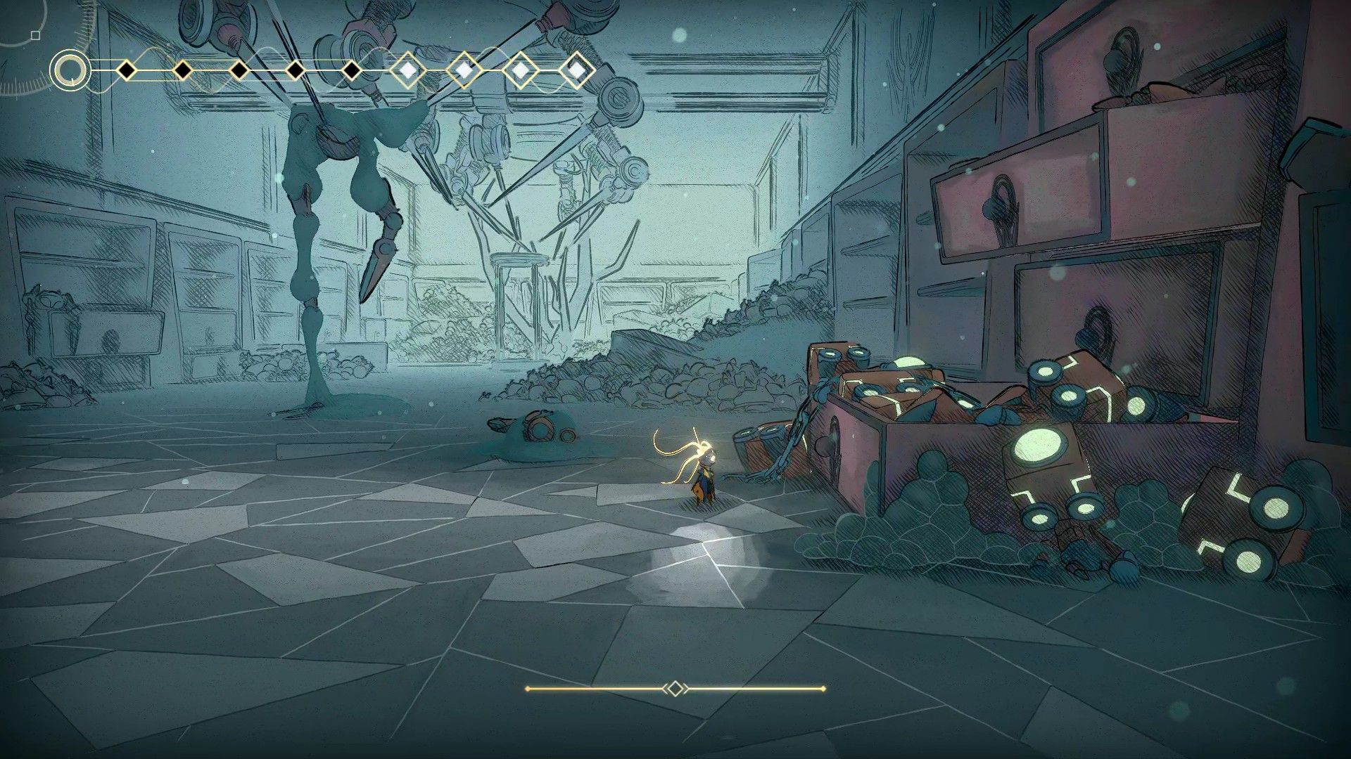 You’ll come to a large, empty room. In the lower right corner, you’ll find an open drawer filled with robot parts. This drawer actually conceals a hidden entrance to the next area.