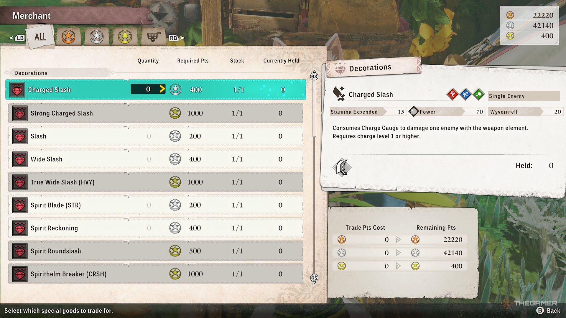 | Spirit Roundslash* | 1/1 | 500 Gold Trade Points |