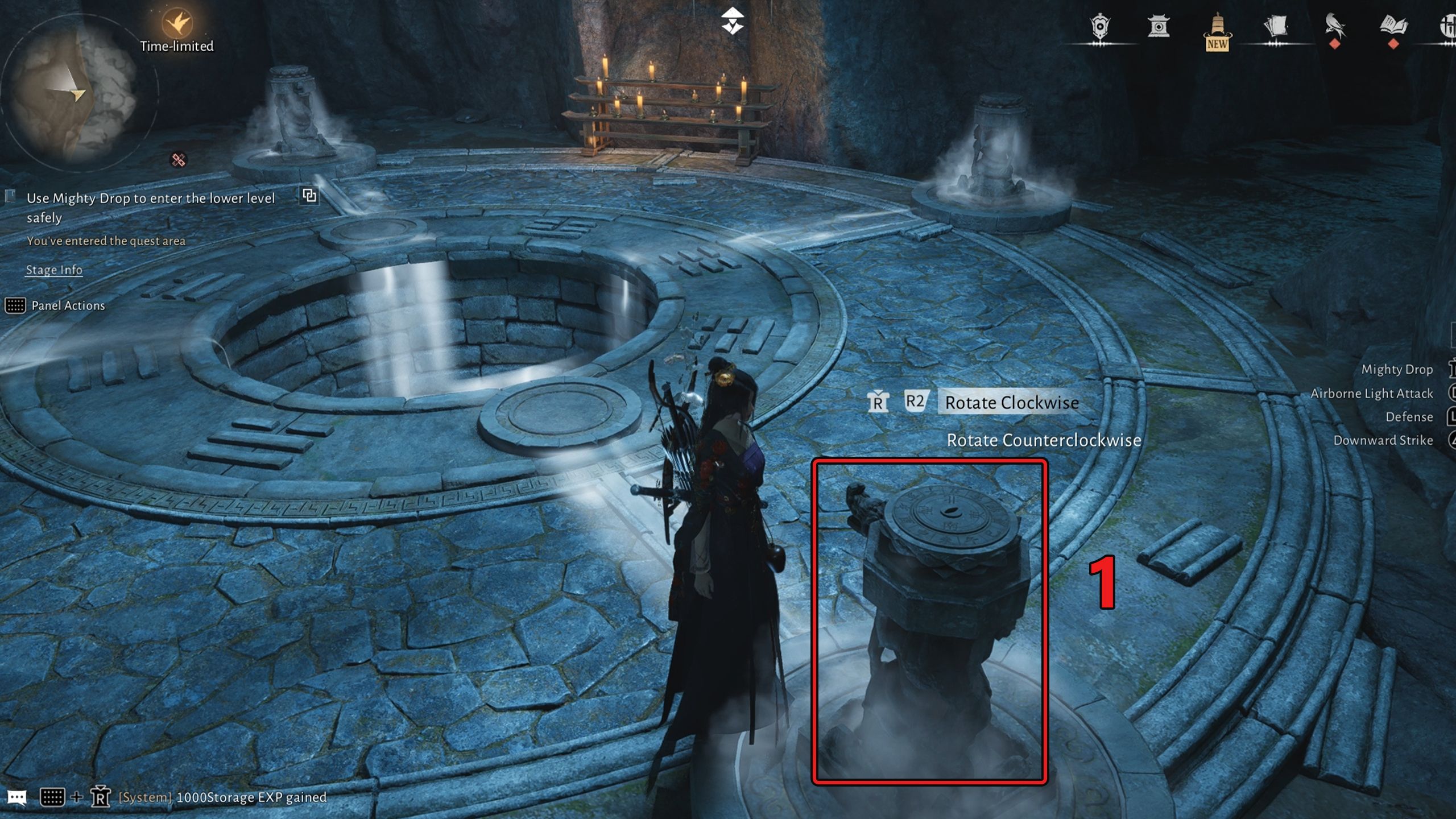 Now, turn the device on the left candle shelf counter-clockwise once, then move to the device on the right and turn it clockwise twice. These are the fire and water puzzles. Finally, turn the Yin-Yang Dial one last time to solve the Tai Chi mystery and open the path downwards.
