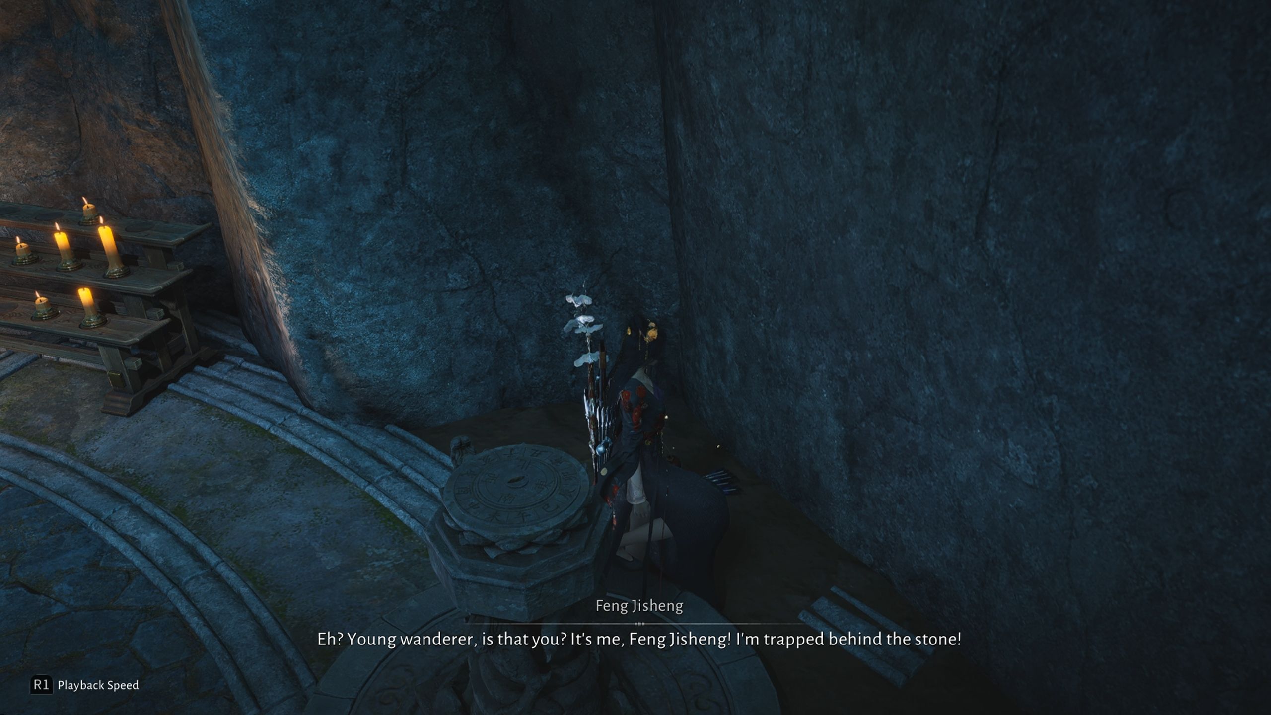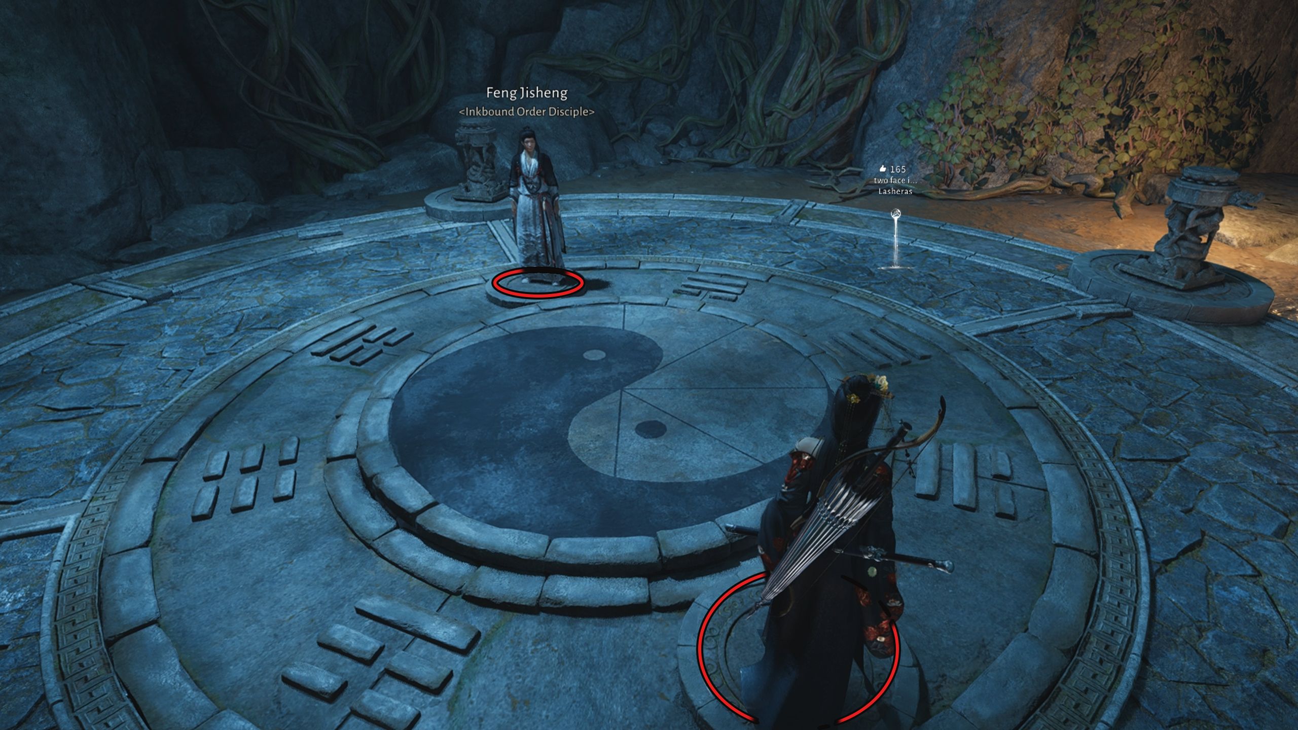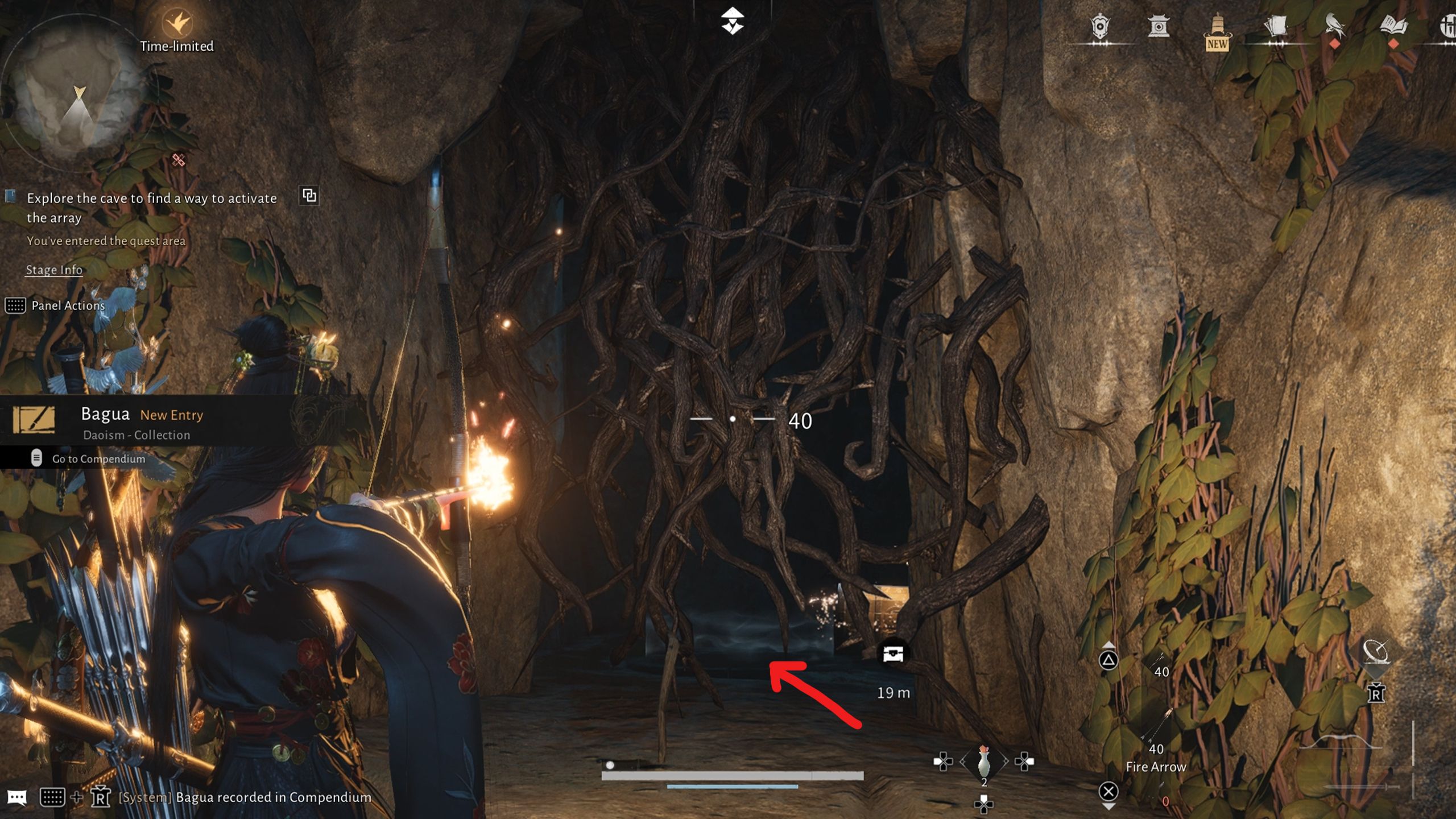 Once you discover the voice belongs to Feng Jisheng, challenge him to an archery contest at the start of WWM, then head to the tree roots and use a fire arrow to destroy them.