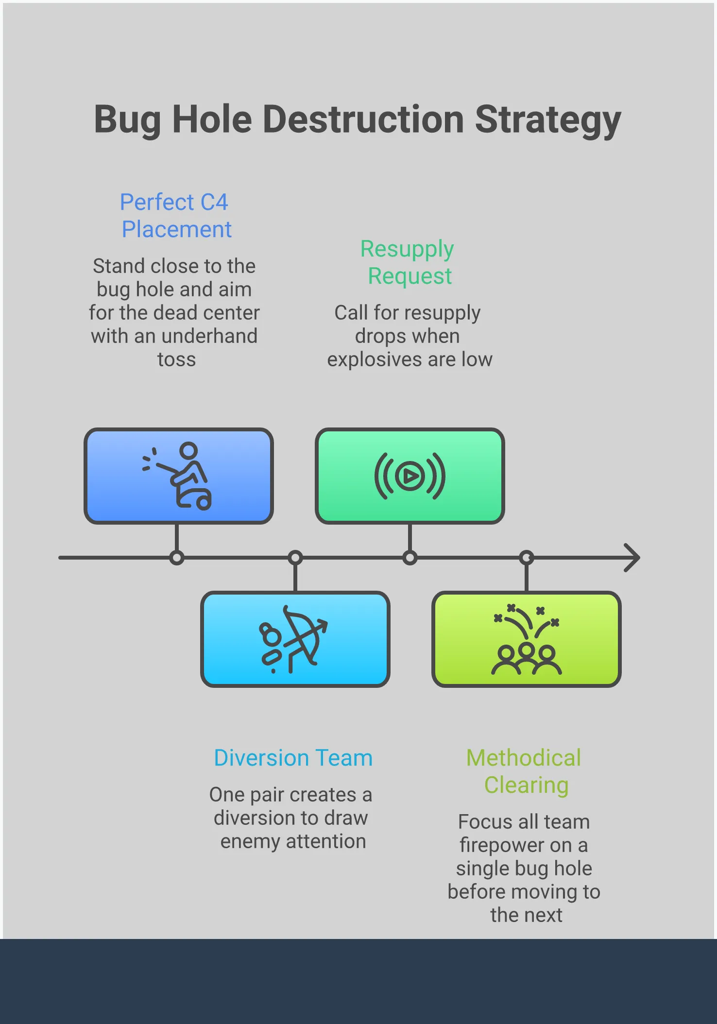 Before you use the C4, tell your team what you’re doing and which bug holes you’re targeting. This avoids accidentally hitting a teammate when you detonate. Also, be clear about what C4 can destroy – it’s not effective on the biggest nests. Let everyone know which holes you can handle and if you need an Eagle Airstrike for the larger ones. A quick message like, ‘I’m using C4 on the small and medium holes, we need airstrike support for the large ones,’ will help keep everyone safe and coordinated.