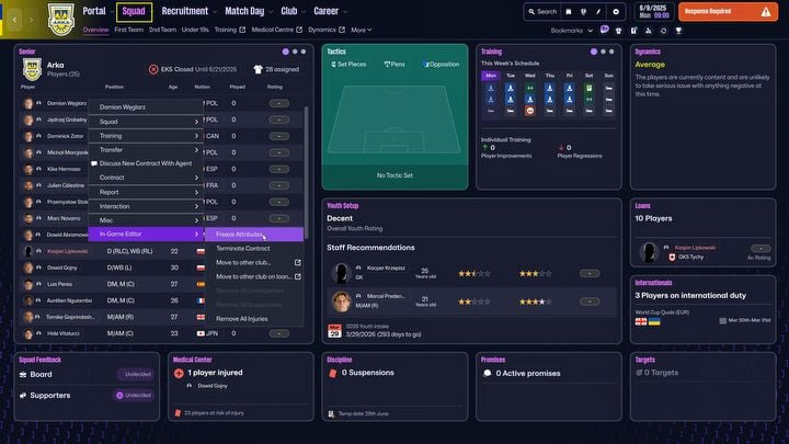 - Now, you can right-click any player you want to edit and see a new option at the bottom of the menu “In-Game Editor” (if you can’t see it, save FM26, close the game and load it). Here you can choose some basic commands – Freeze Attributes, Terminate Contract, Move to other club, Remove all Unhappiness / Suspensions / Injuries. However it is far from over.
