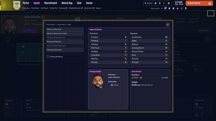 - The editor has 4 sections – the general one (the same you see when you right-click the player on the Sqad screen), Player Attributes (remember that there are various categories of attributes that you can change), Personal Details and Club Contract. After clicking each of them, you will be taken to separate menus that will allow you to further change the footballer.