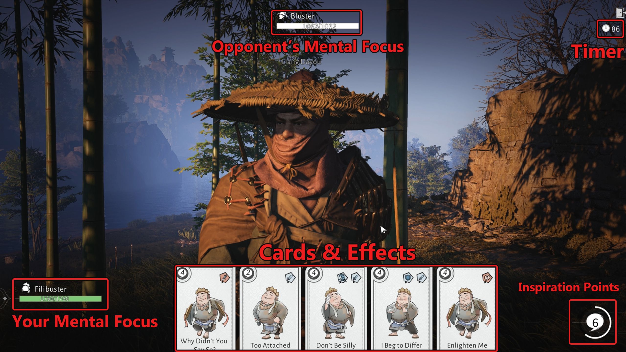 In Where Winds Meet, the main objective of each Gift of Gab is to deplete your opponent’s mental focus to zero. You can track your own mental focus on the bottom-left of the screen, and your opponent’s at the top-center. Each card you play has different effects, like boosting your attack or defense, temporarily stopping your opponent’s abilities, lessening damage you take, or regaining mental focus, among other things.